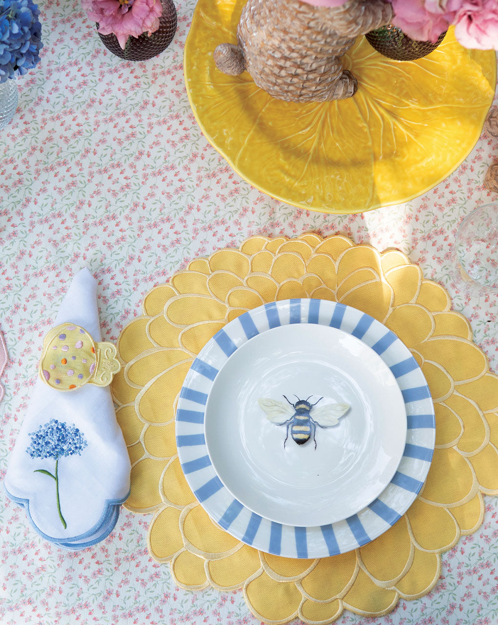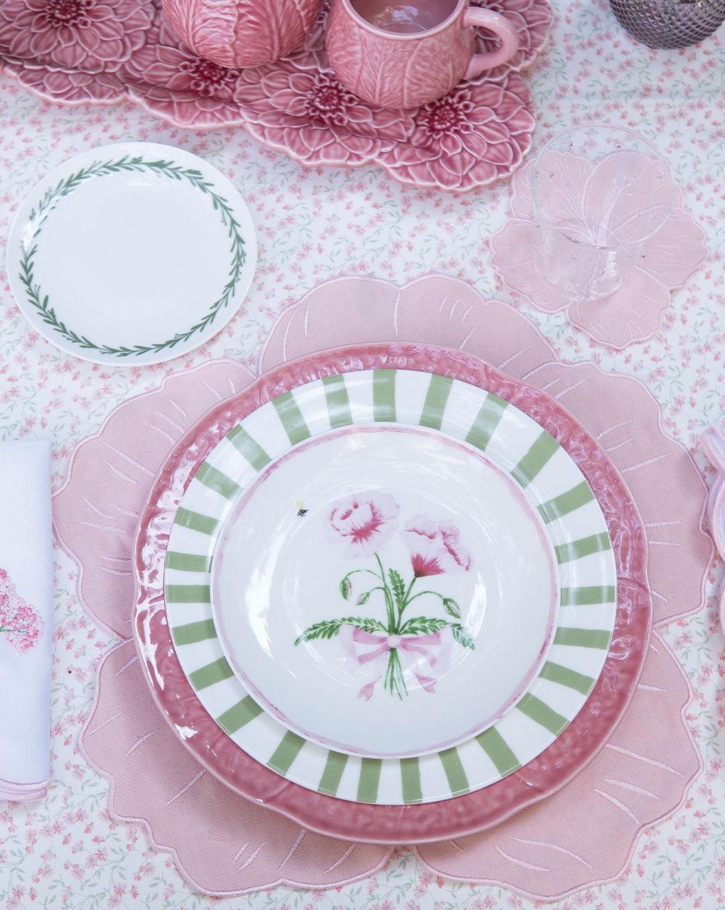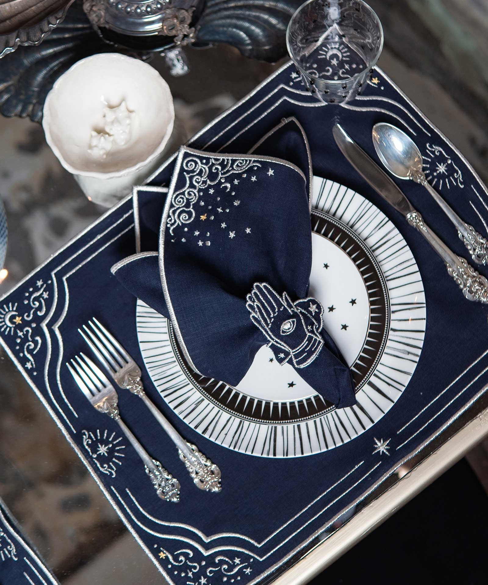 Inspirado en los olivos, esta colección incluye individuales blossom en verde y morado, servilletas bordadas con olivos y la colección Olival de Bordallo Pinheiro.