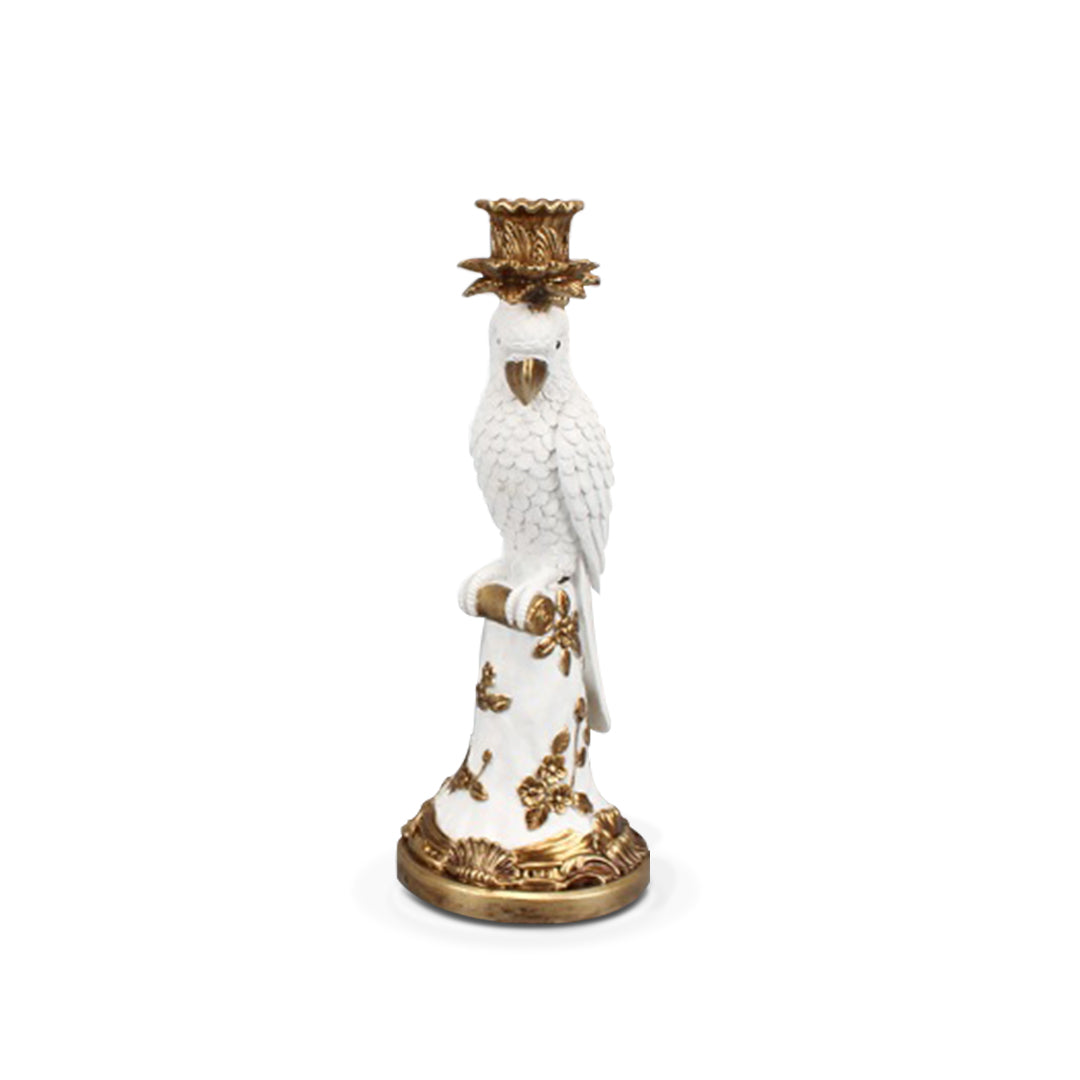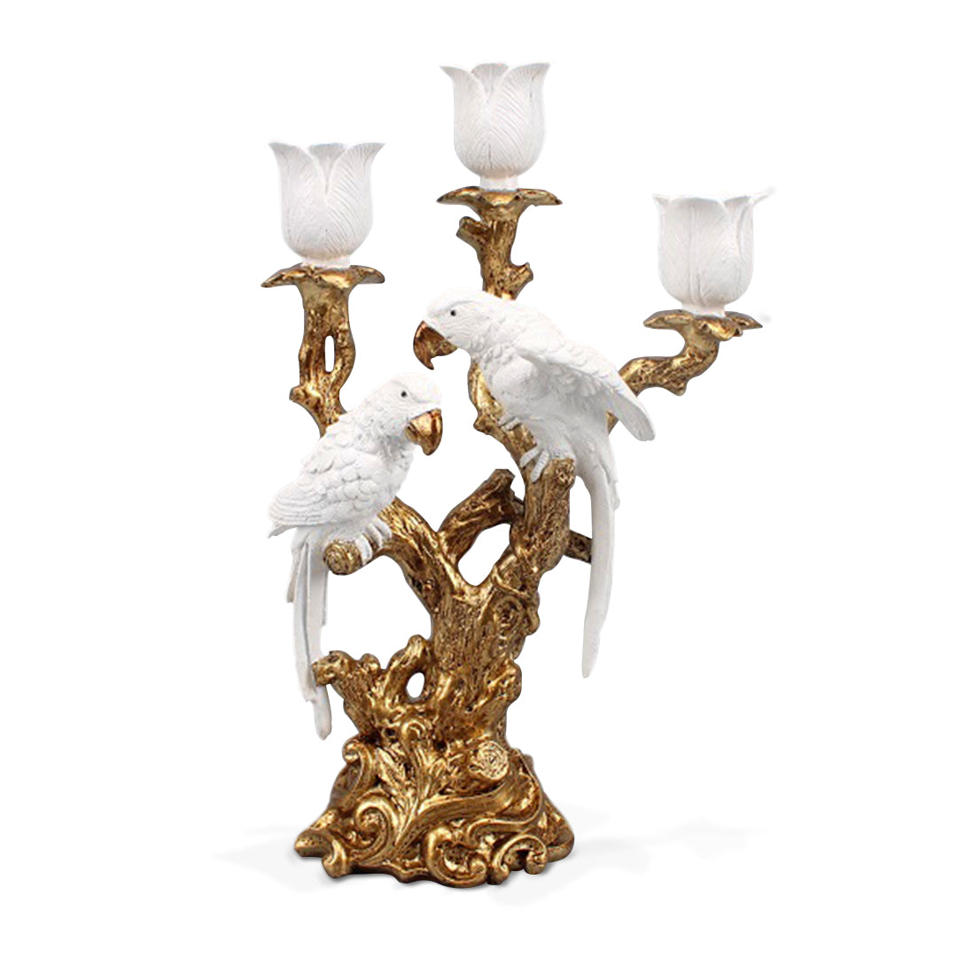 Candelabro para 3 Velas con Pericos Hecho en Resina Color Blanco con Dorado