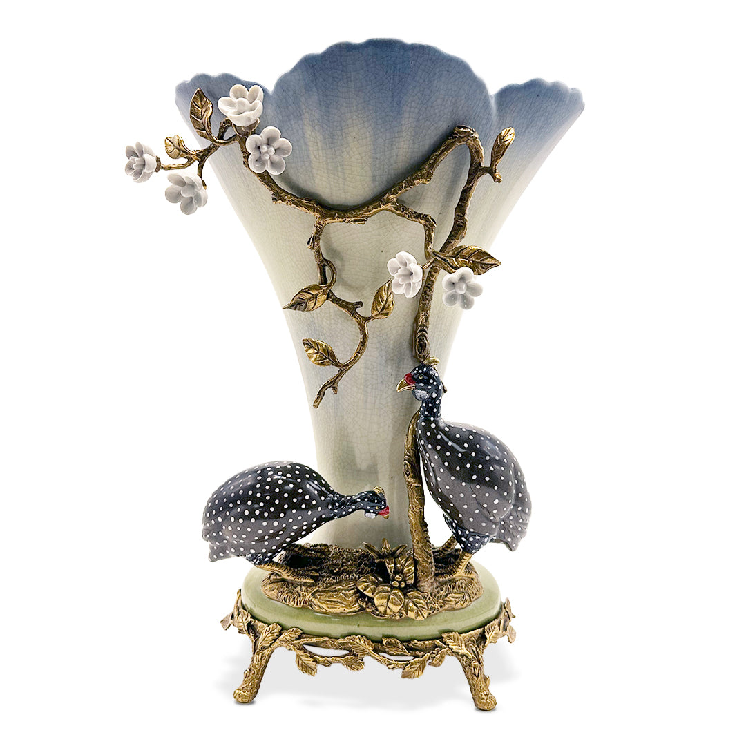 Vasija Ariel de Porcelana en Forma de Flor con Decorado de Pajaros y Ramita con Flores.