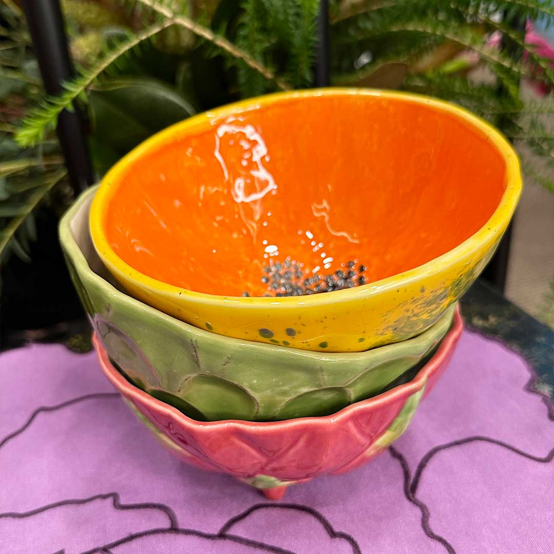 Llena tu mesa de frescura tropical con este juego de 4 bowls de cerámica con forma de papaya de Bordallo Pinheiro.