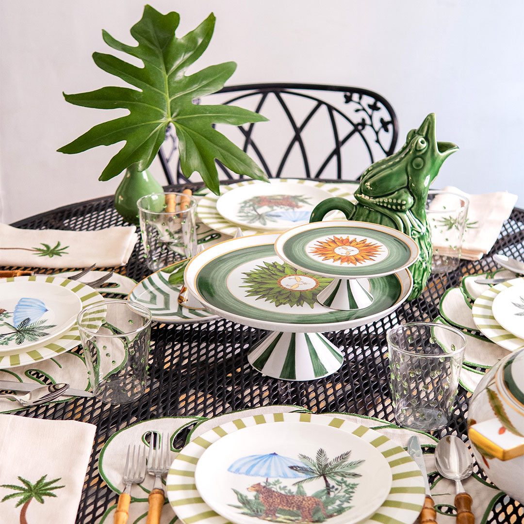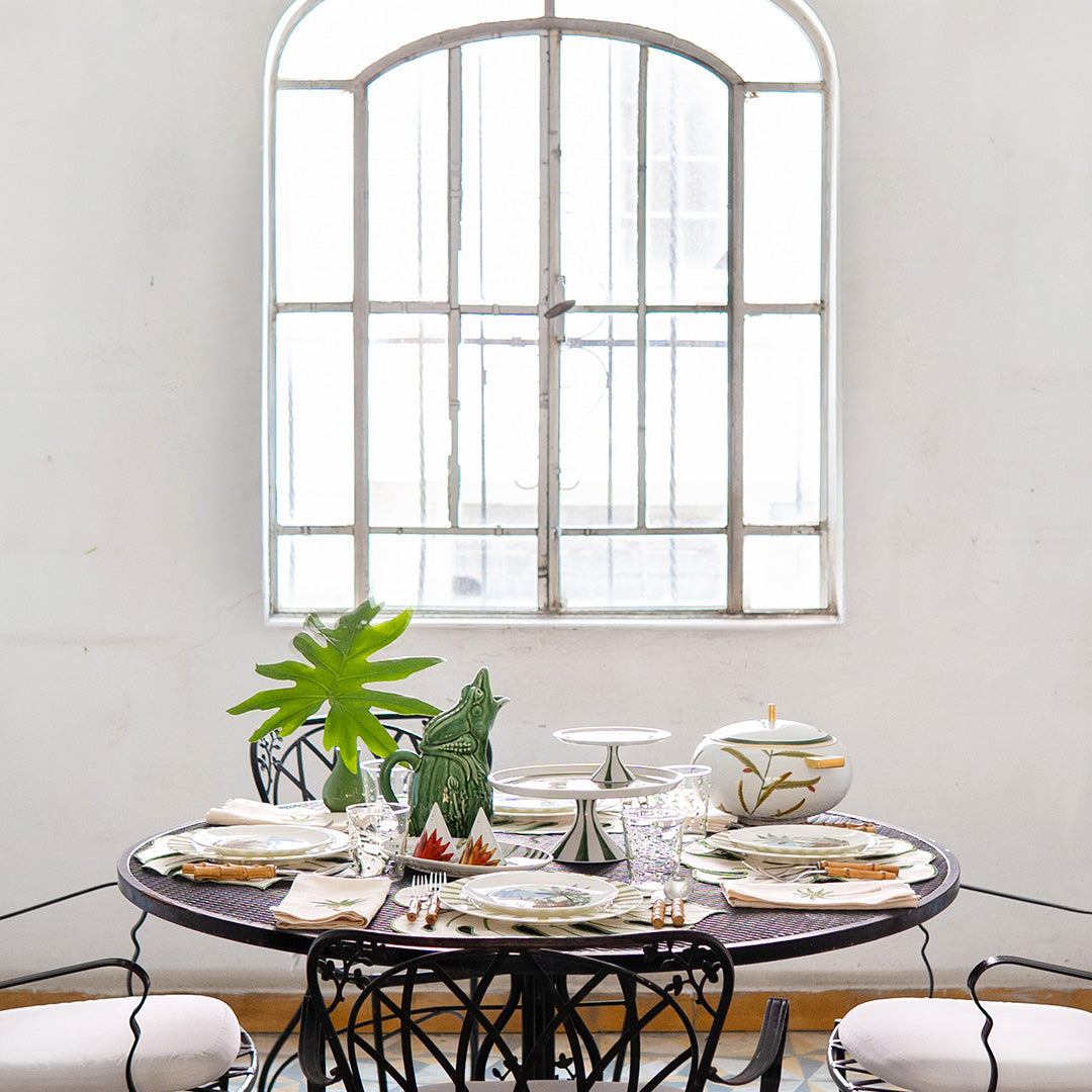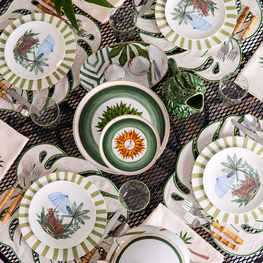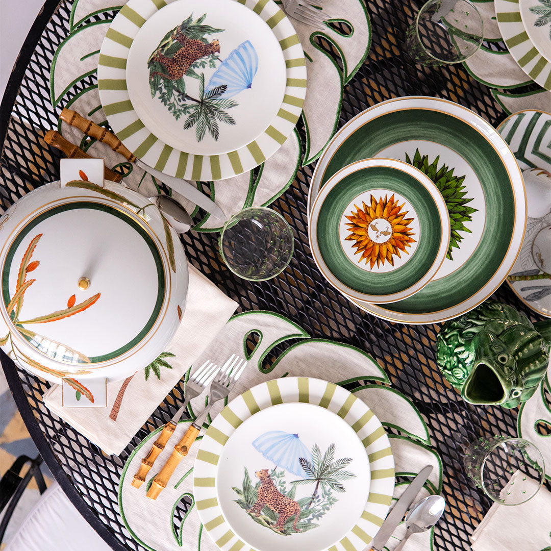 La colección Amazonia de Vista Alegre es fresca y sofisticada. Diseños tropicales en platos de porcelana que nos transportan al Amazonas. Amamos combinar con Amazonia de Bordallo Pinheiro y con Tropic de Zash. Orilla con oro de 24 kilates.