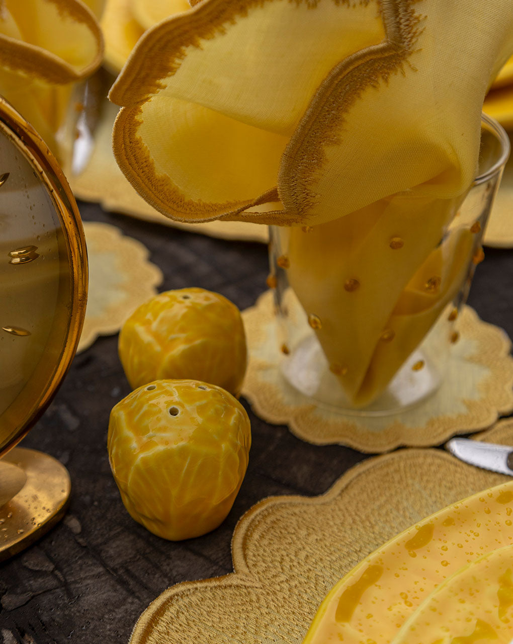 THE YELLOW MEADOW ZASHPACK: 4 Coasters Vivi en Lino Amarillo con Bordado de Pelitos y 6 Vasos Pippa con Puntitos Amarillos