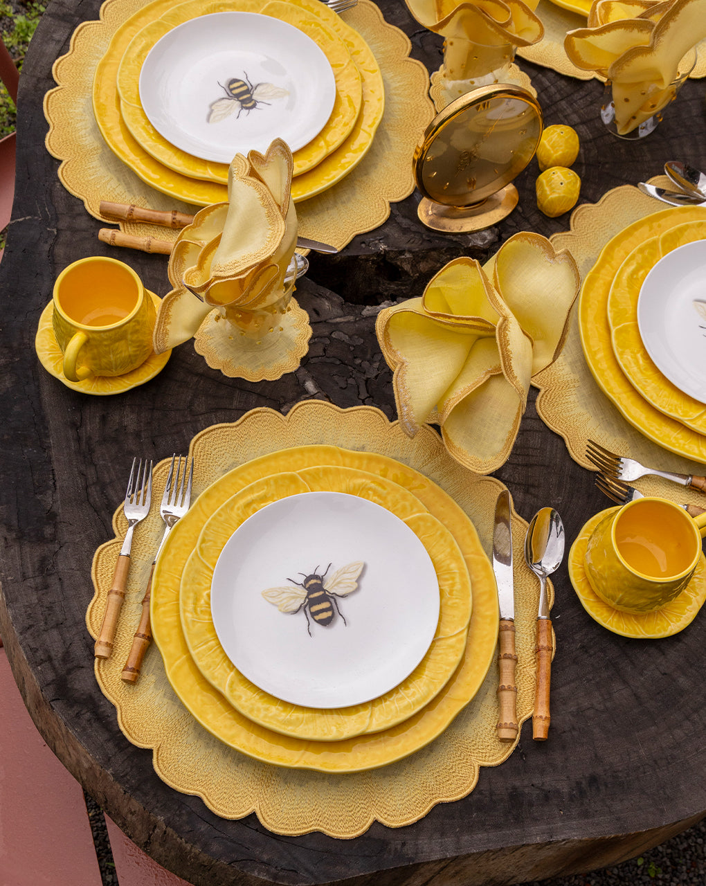 Vajilla con Platos Trinche y Pan de Repollo Amarillo Canario y Platos para Ensalada con Abeja. Set para 4 personas