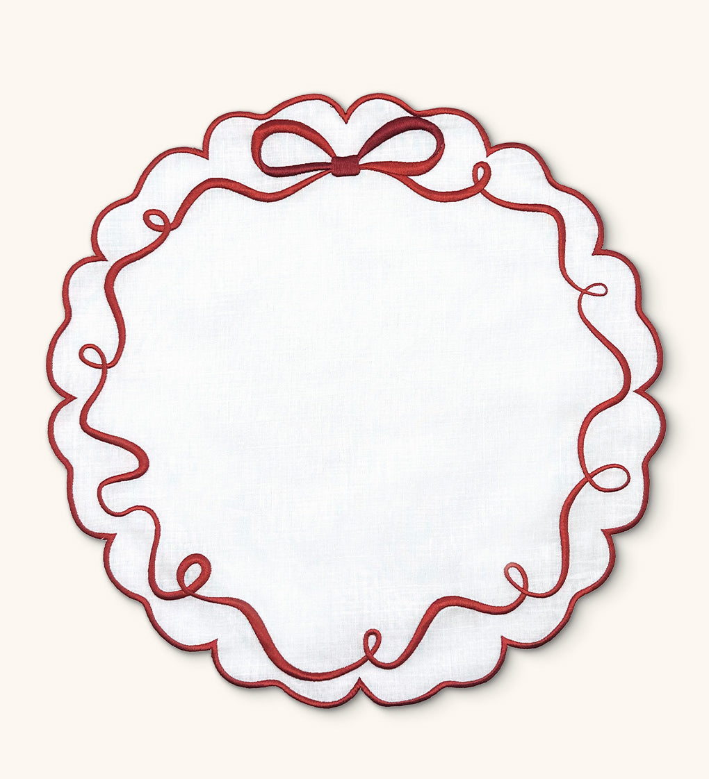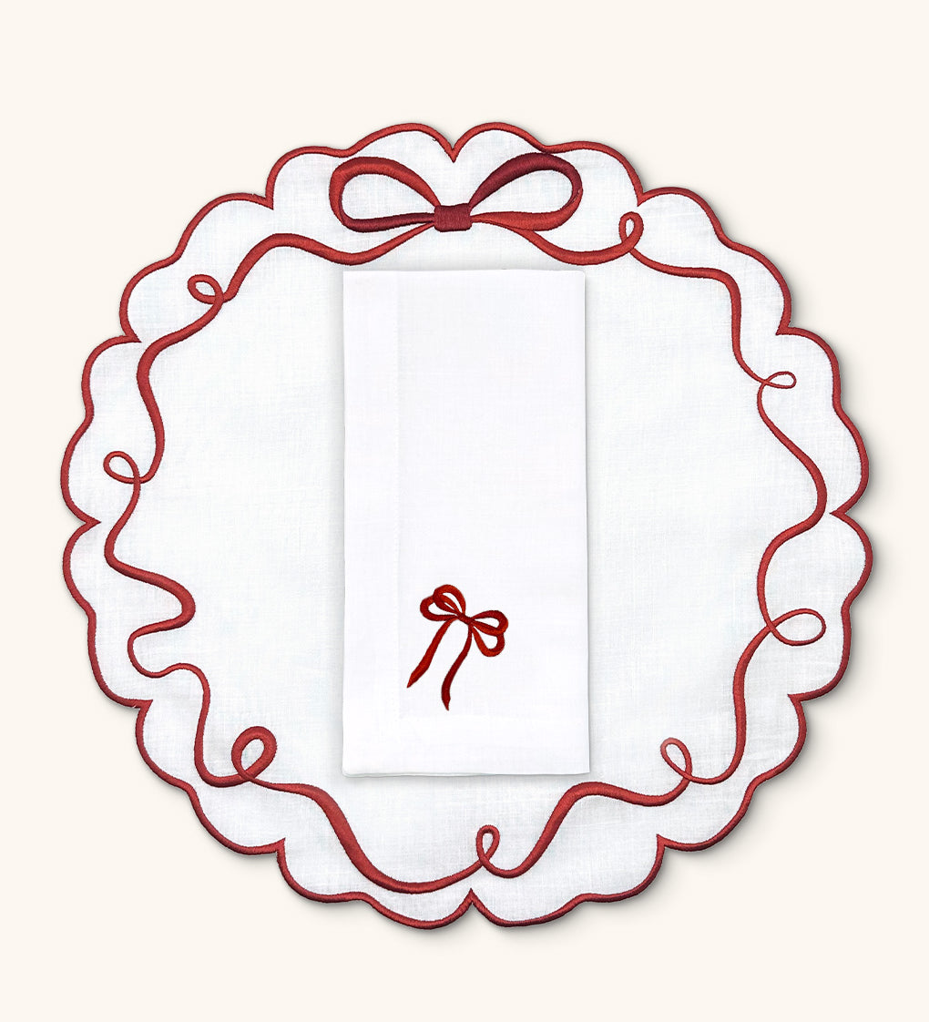 Individuales Red Bow en Lino Blanco con Bordado de Moño Rojo. Set de 4