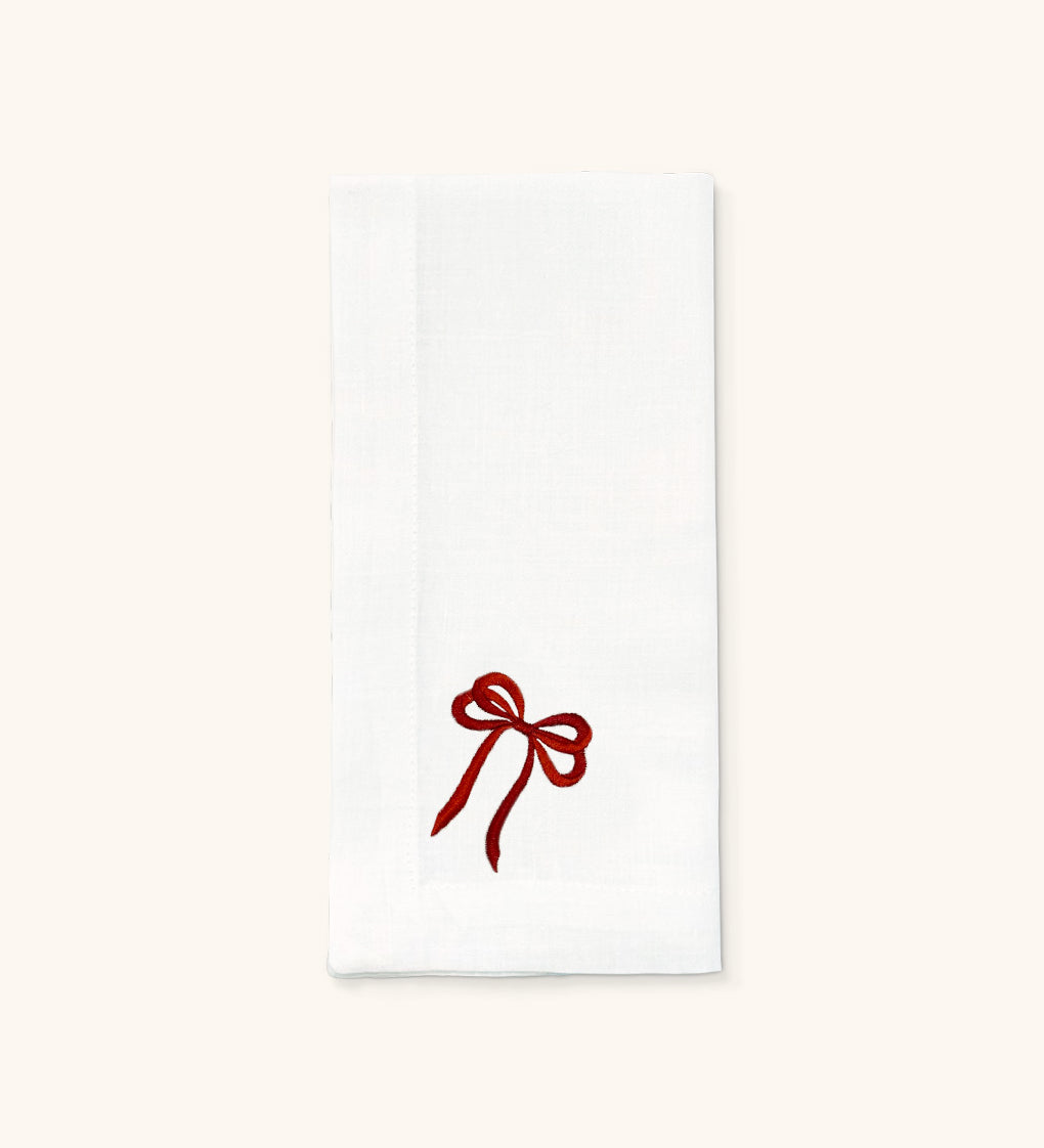 Servilletas Red Bow en Lino Blanco con Bordado de Moño Rojo. Set de 4