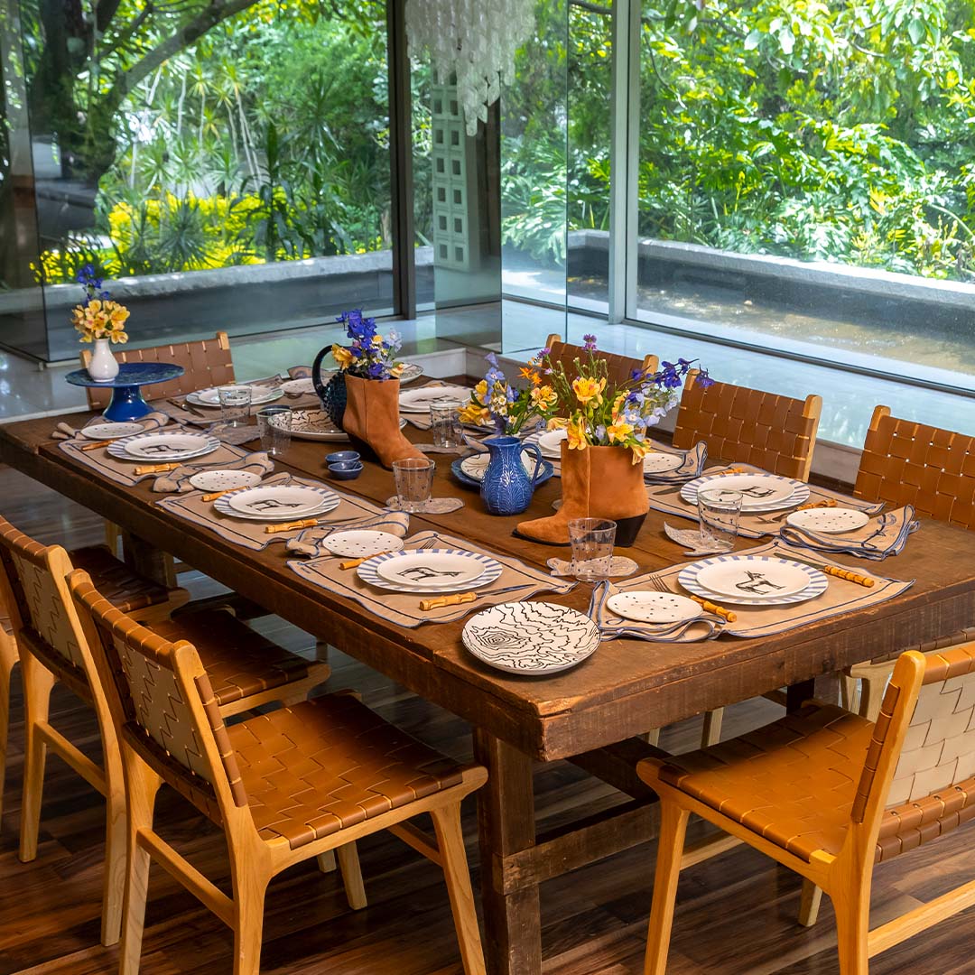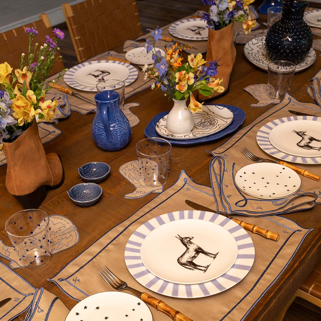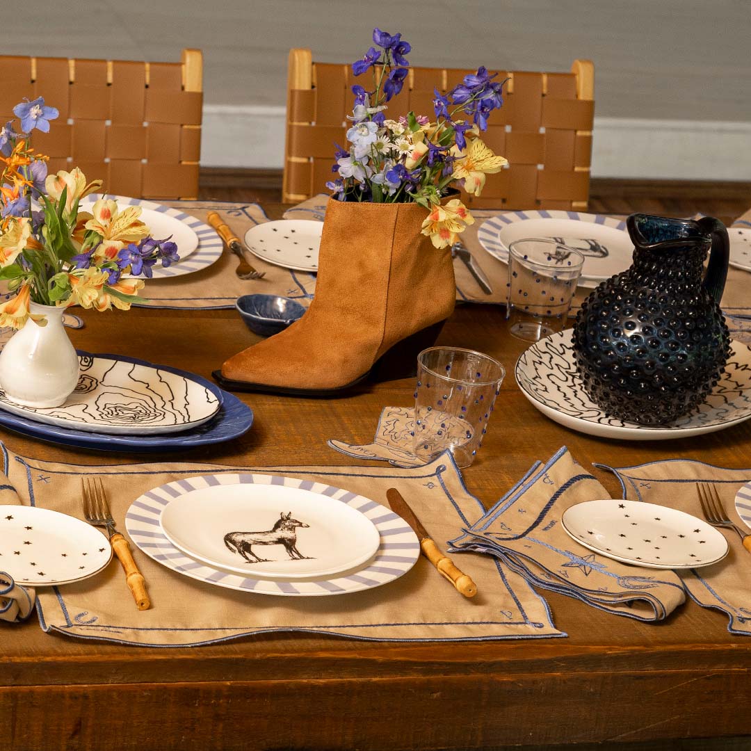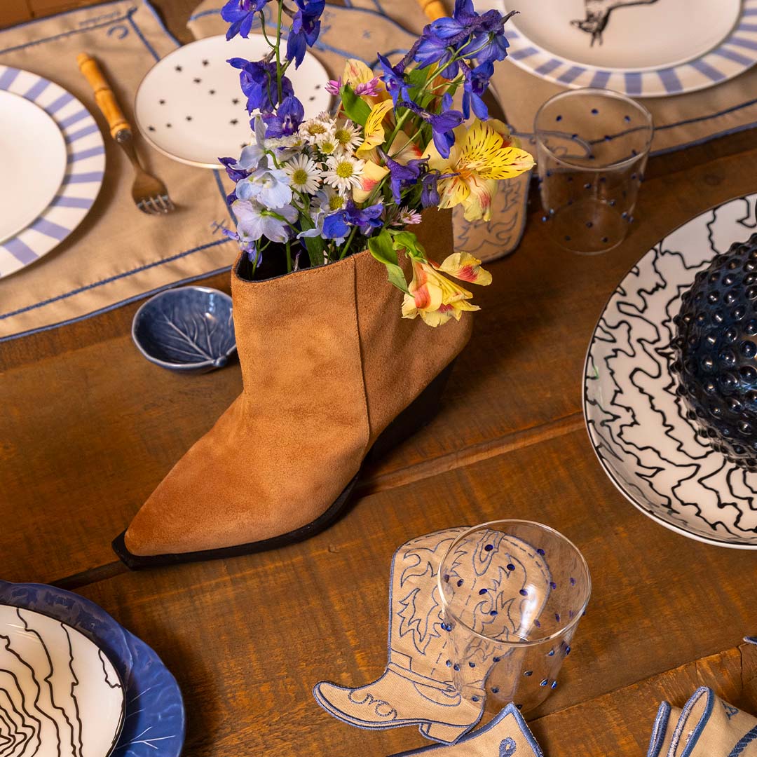 Servilletas cocteleras en forma de bota vaquera en lino caramel con bordado azul, marca Zash