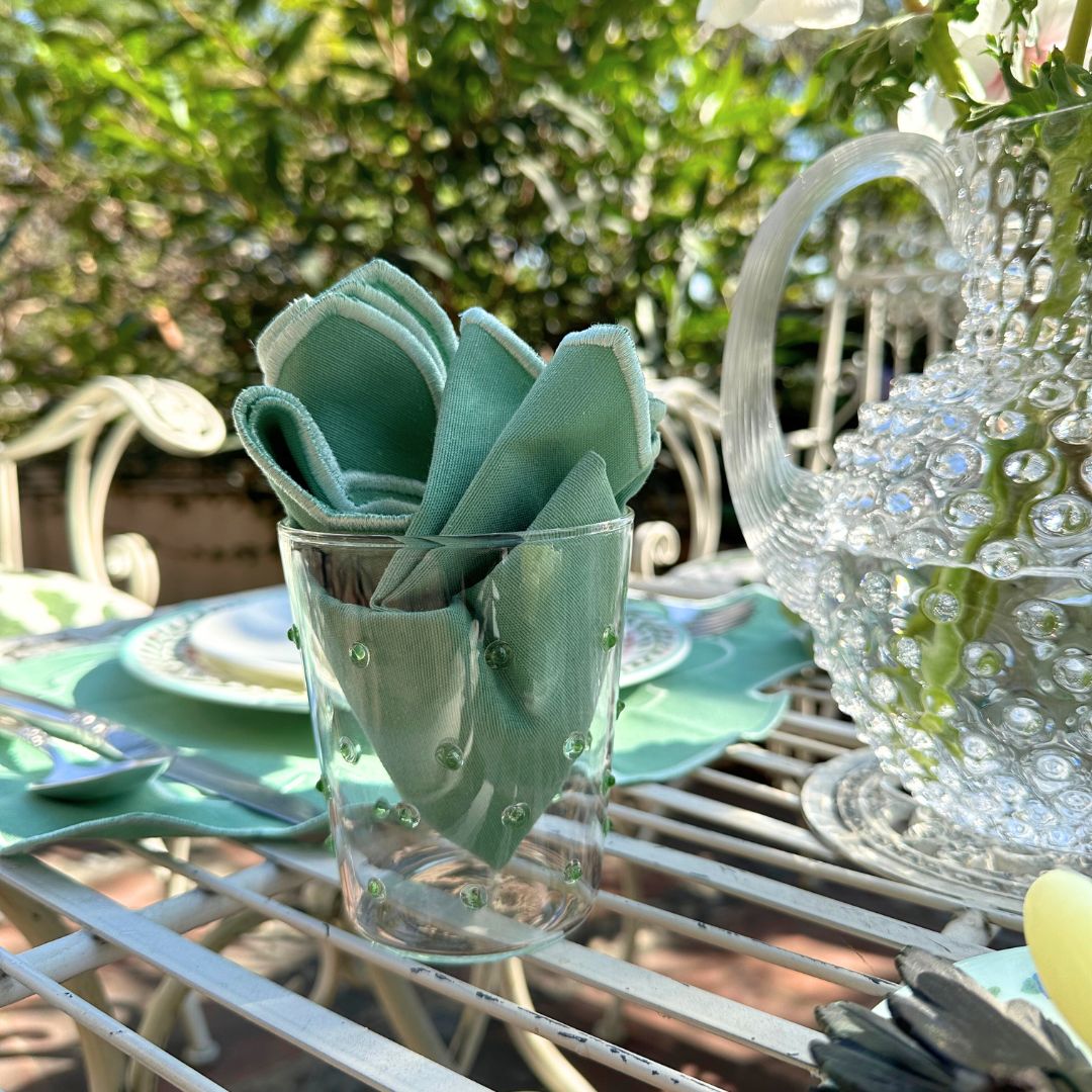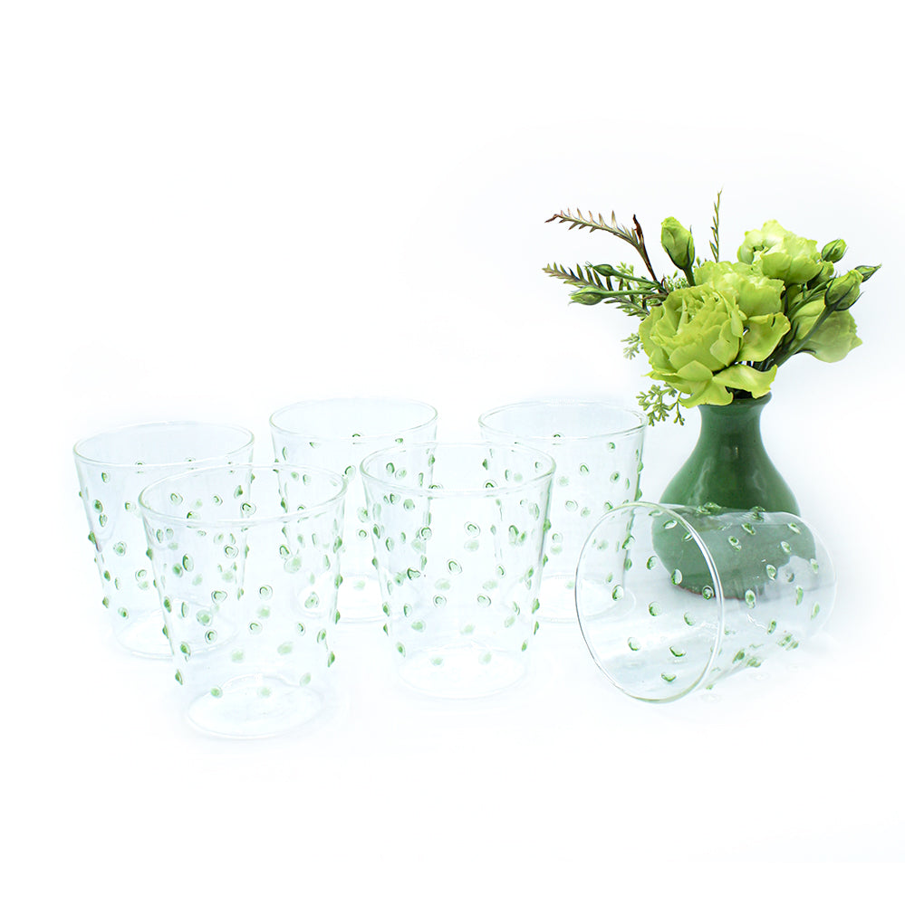 Set 6 vasos de vidrio con puntitos verdes hecho de forma artesanal.