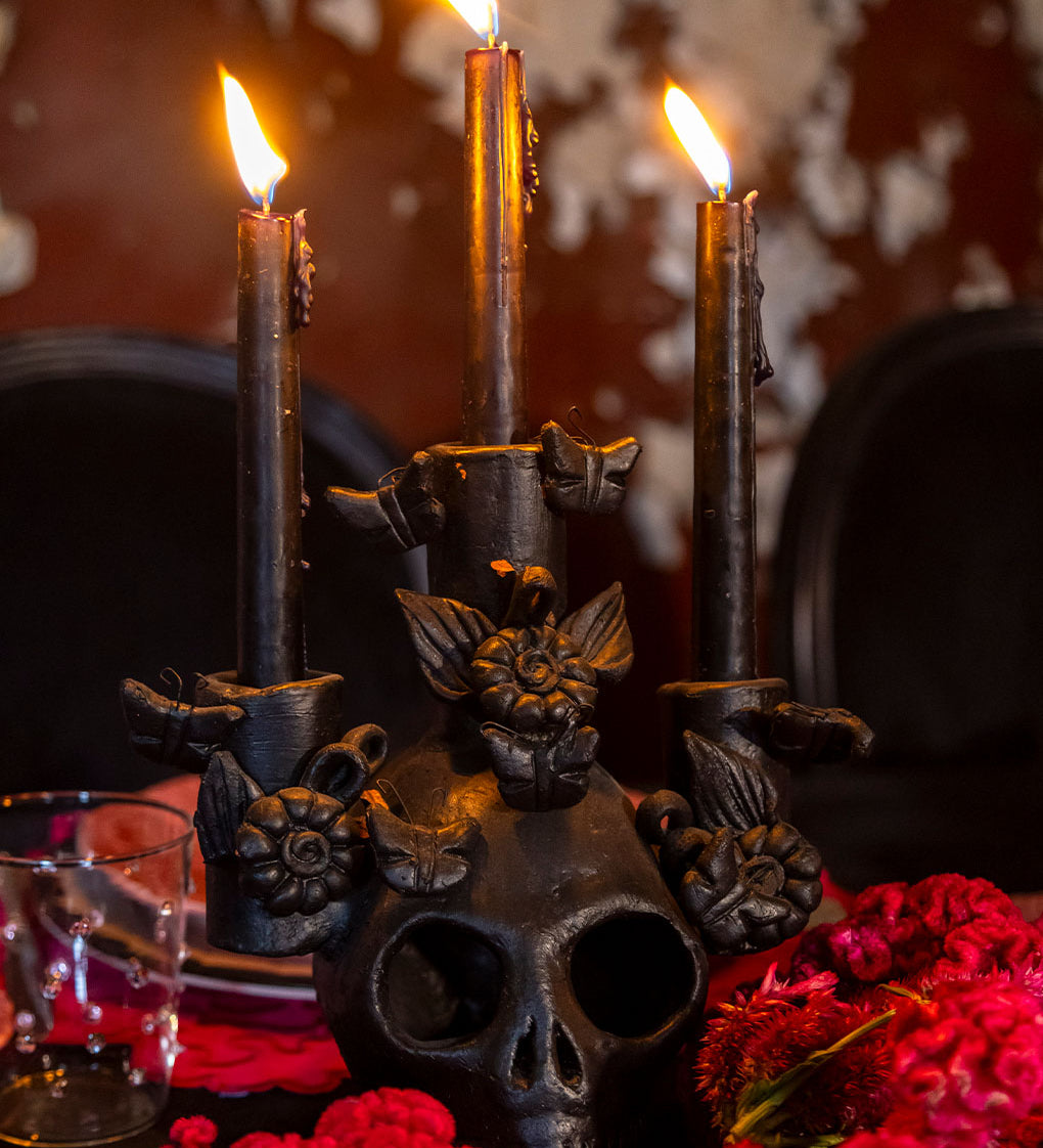 Candelabro Artesanal en Forma de Catrina Color Negro de Barro