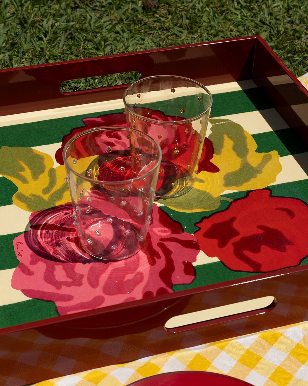 - Una charola cuadrada con rayas beige y verde junto un estampado de flores, con un borde rojo.