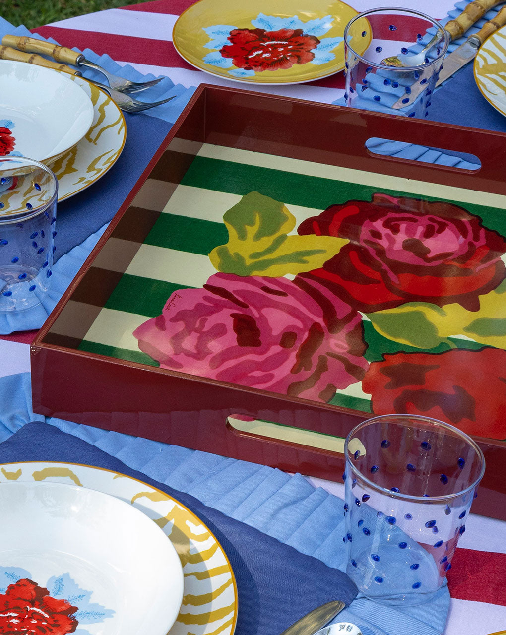 Su diseño con rayas atemporales y flores vibrantes, crea un setting sofisticado y divertido en tu mesa.