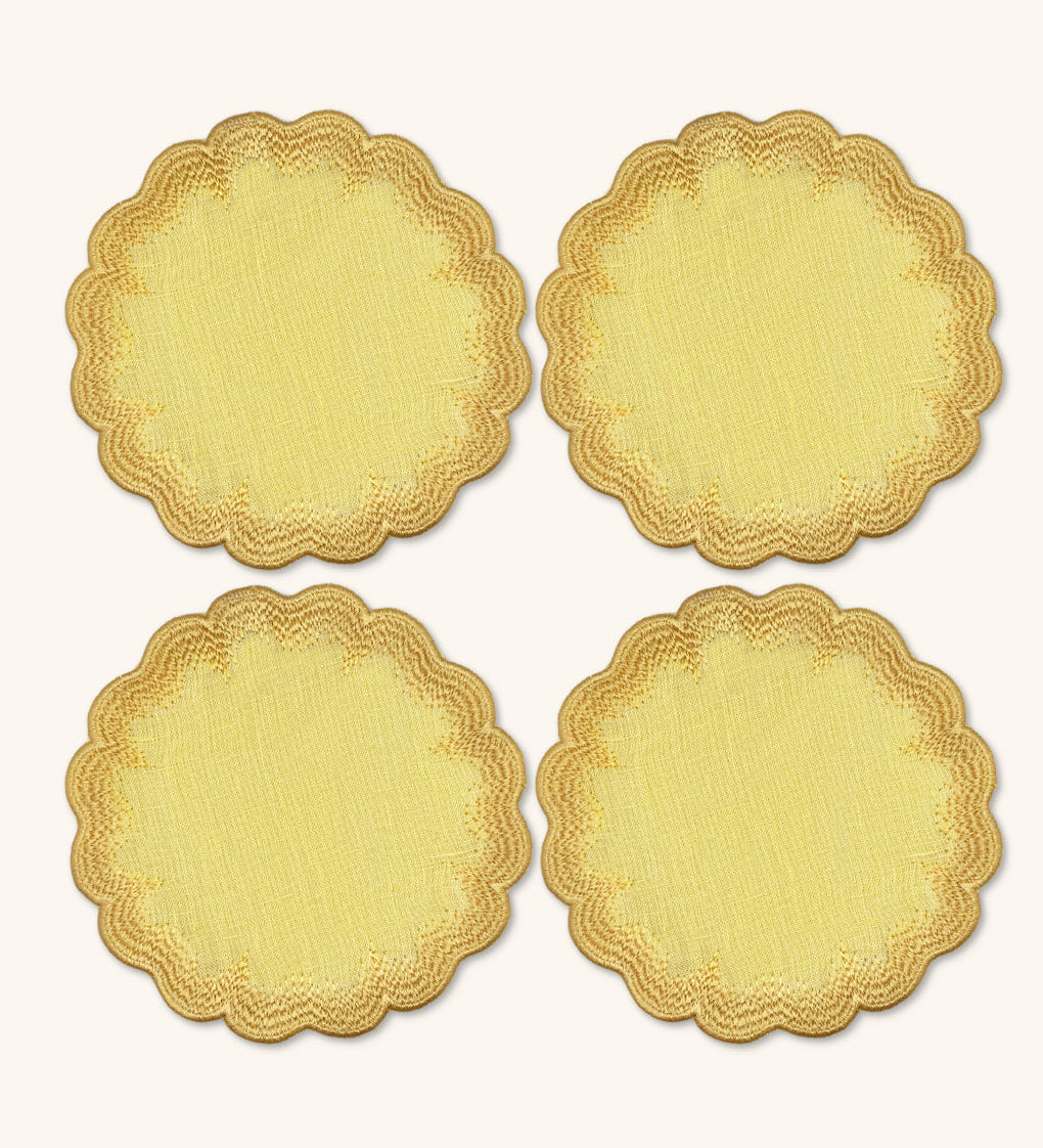 Coasters Vivi en Lino Amarillo con Bordado de Pelitos. Set de 4