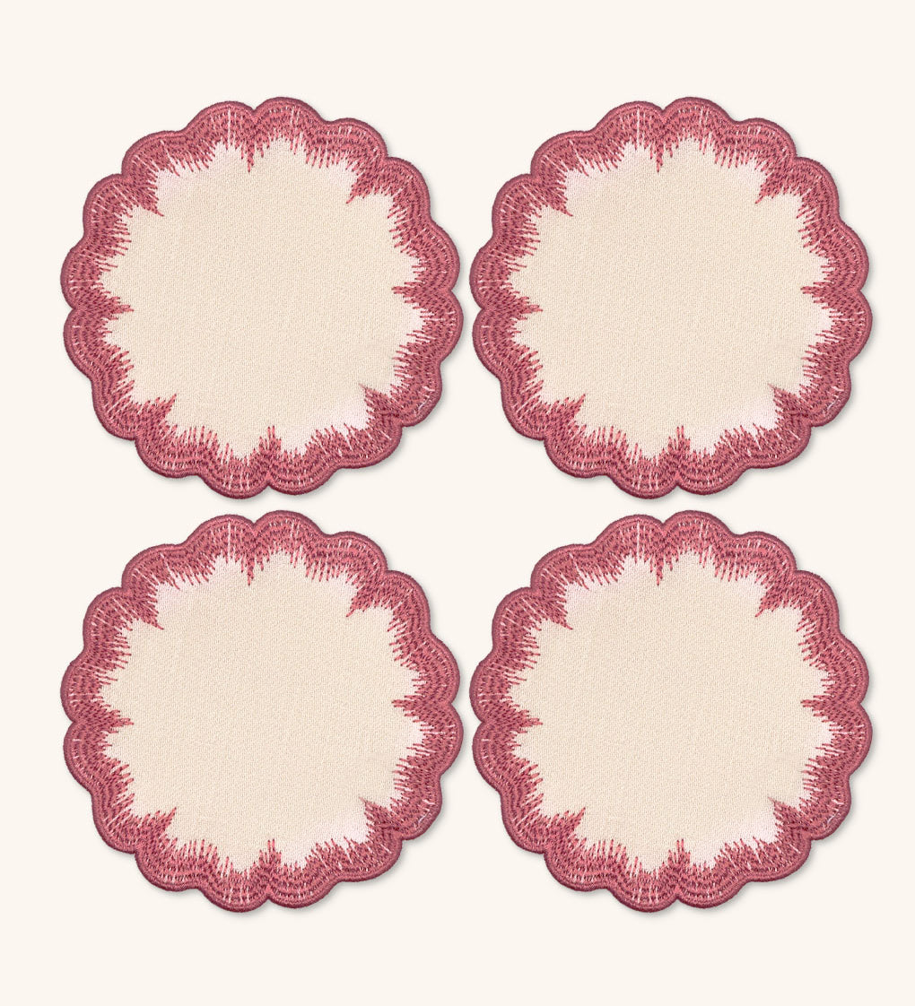 Coasters Vivi en Lino Rosa con Bordado de Pelitos. Set de 4