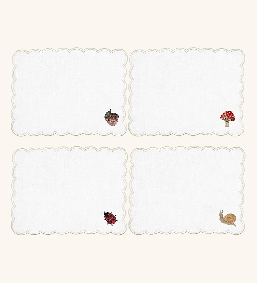 Cocteleras Fall en Lino Blanco con Bordado de Catarina, Bellota, Caracol y Hongo. Set de 4