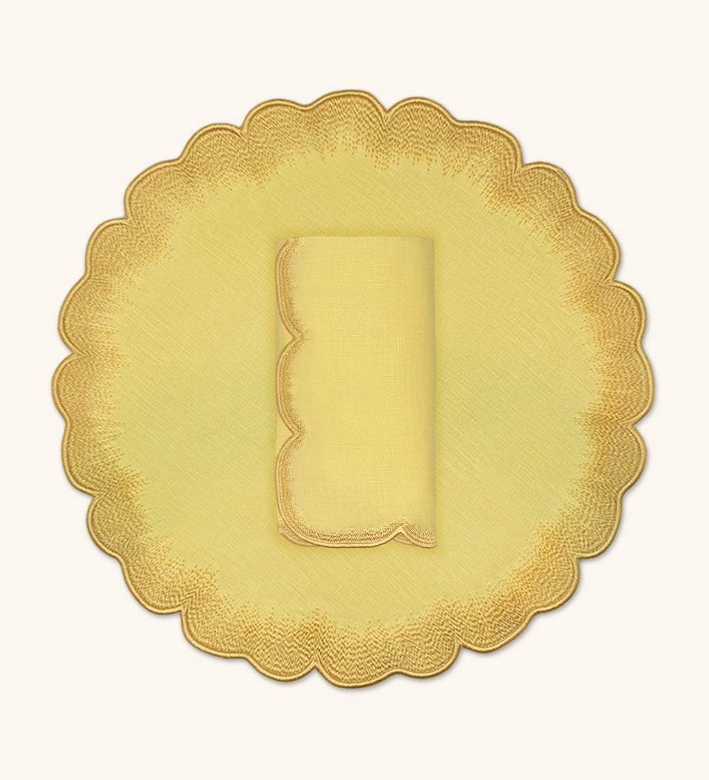 Set de Mantelería Vivi con Individuales y Servilletas en Lino Amarillo con Bordado de Pelitos. Set para 4 personas