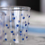 Set 6 vasos de vidrio con puntitos azules hecho de forma artesanal.