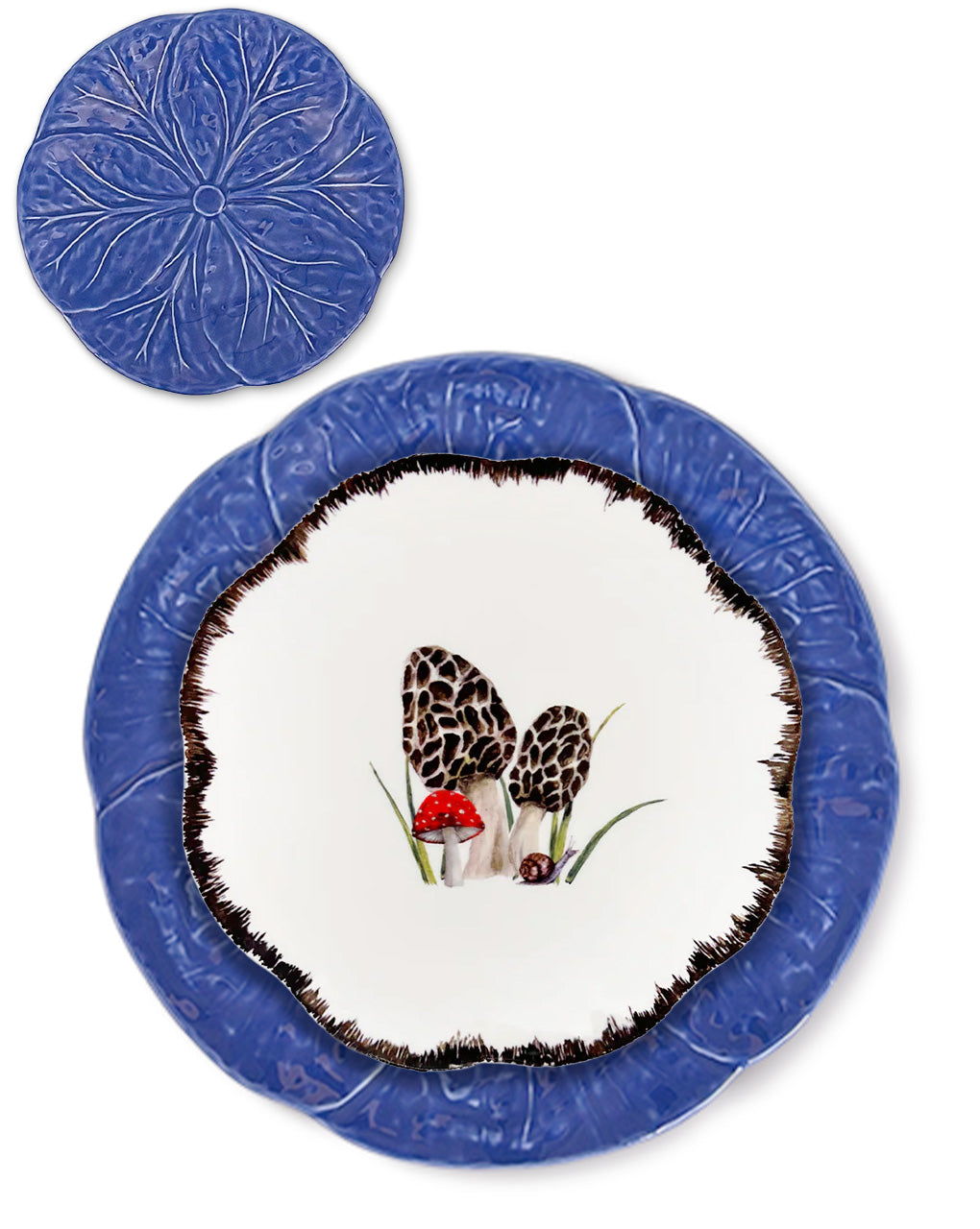 Vajilla con Platos Trinche de Repollo Azul Cobalto y Platos para Ensalada con Hongos Morillas. Set para 4 personas
