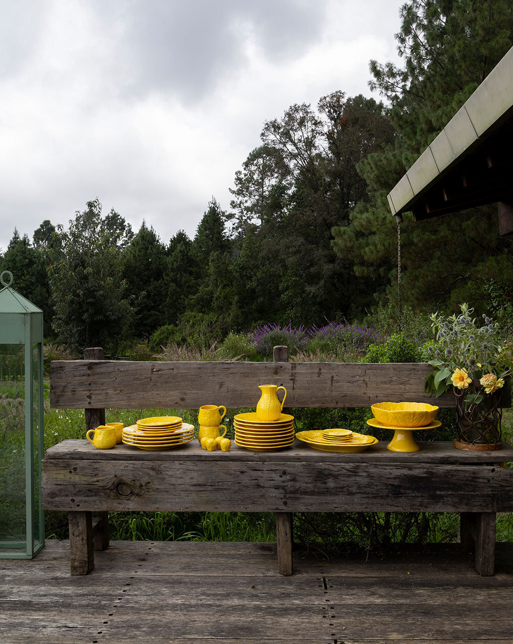Vajilla con Platos Trinche y Pan de Repollo Amarillo Canario y Platos para Ensalada con Abeja. Set para 4 personas