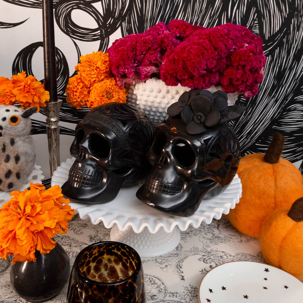 Los novios catrines en barro negro de Oaxaca, elaborados de forma artesanal. Un centro de mesa para impactar, que se ve divino con los platos de calaca.