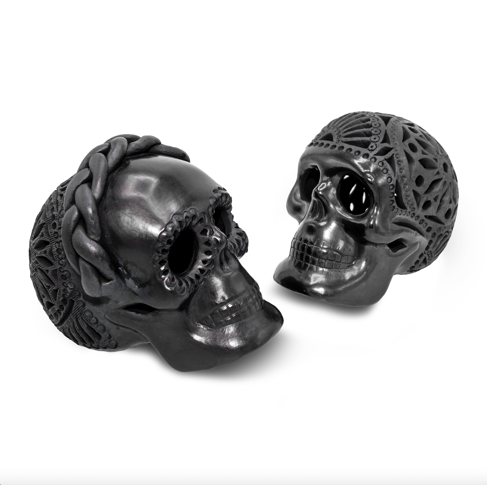 Pareja de calaveras, hombre y mujer, de barro negro oaxaqueño. Centro de Mesa.