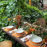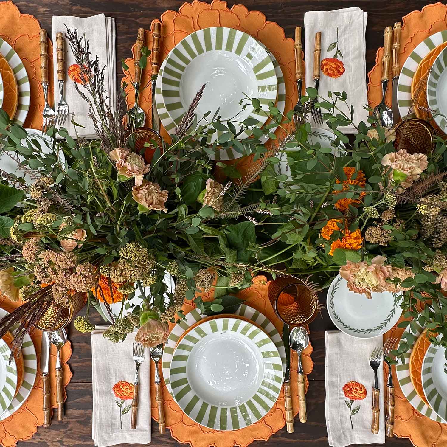 Individual en Forma de Flor de Cempasúchil en Loneta Naranja y Servilleta en Lino Crudo con Flor de Cempasúchil Bordada. Set para 4 personas