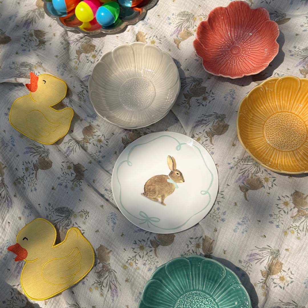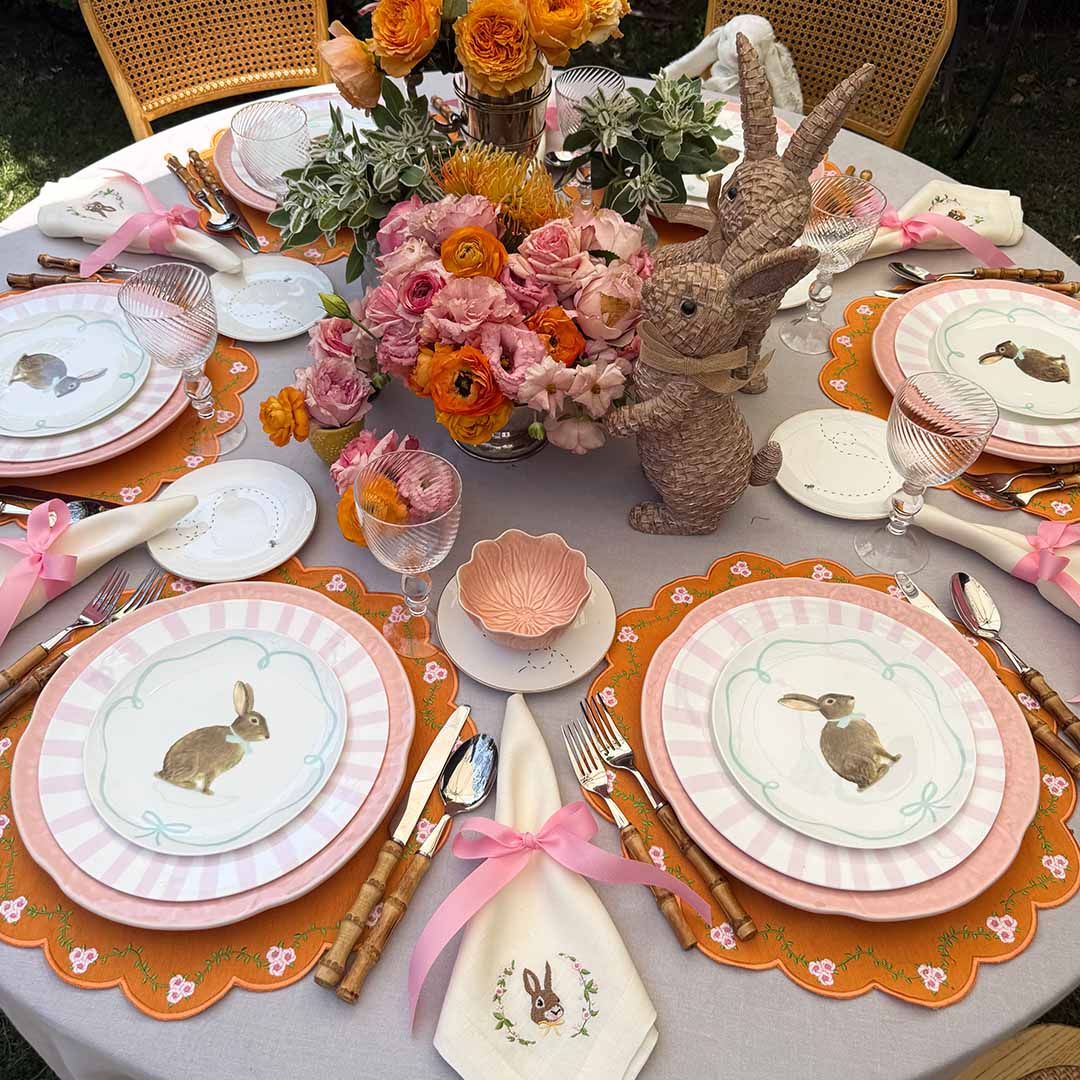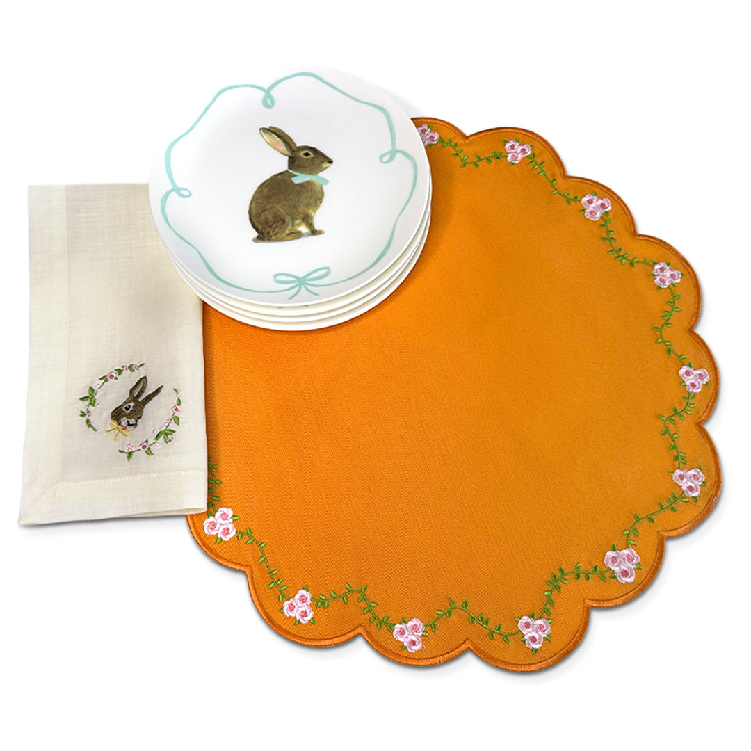 THE EASTER BUNNY ZASHPACK: Set con 4 Individuales Pily en Algodón Naranja con Bordado de Florecitas, 4 Servilletas Easter en Lino Ivory con Bordado de Conejo y 4 Platos para Ensalada con Conejo