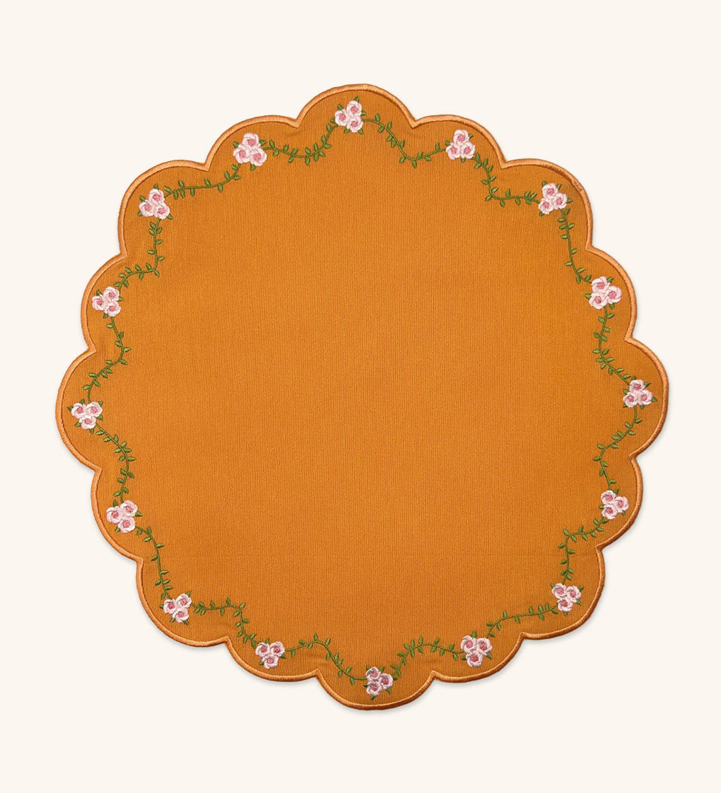 Individual Pily en Algodón Naranja con Bordado de Florecitas. Set de 4