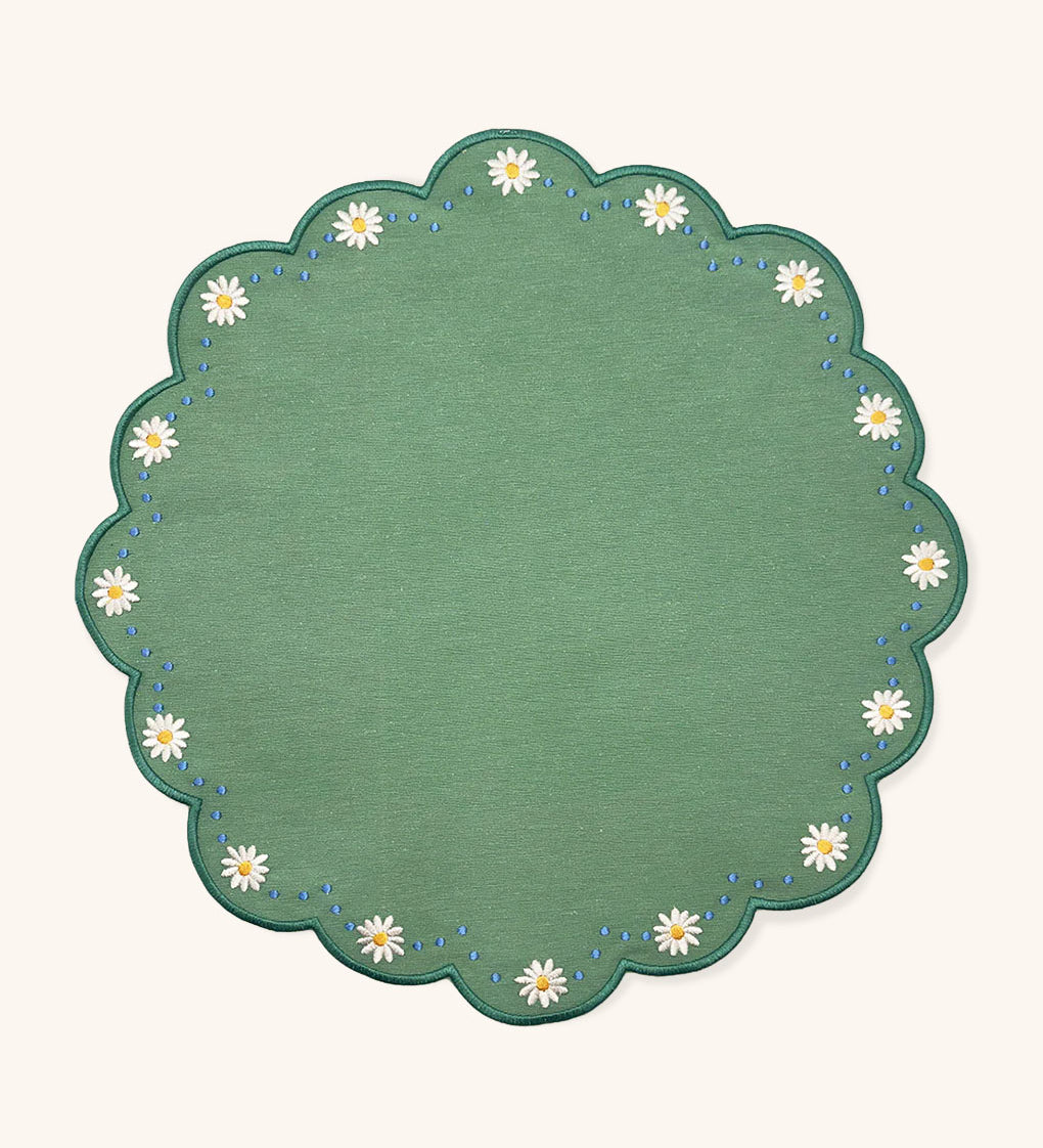 Individual Pily en Algodón Verde con Bordado de Margaritas. Set de 4