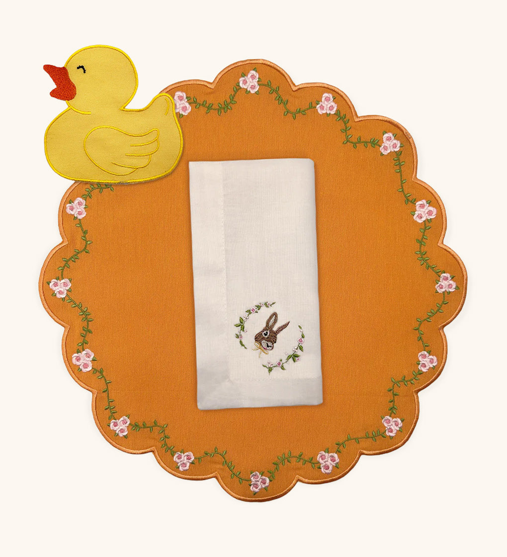 Mantelería Easter con Individual Pily en Algodón Naranja con Bordado de Florecitas, Servilleta Easter en Lino Ivory con Bordado de Conejo y Coctelera en Algodón Amarillo con Bordado de Pato. Set de 4