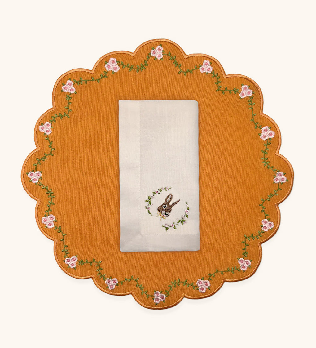 Mantelería Easter con Individual Pily en Algodón Naranja con Bordado de Florecitas y Servilleta Easter en Lino Ivory con Bordado de Conejo . Set de 4