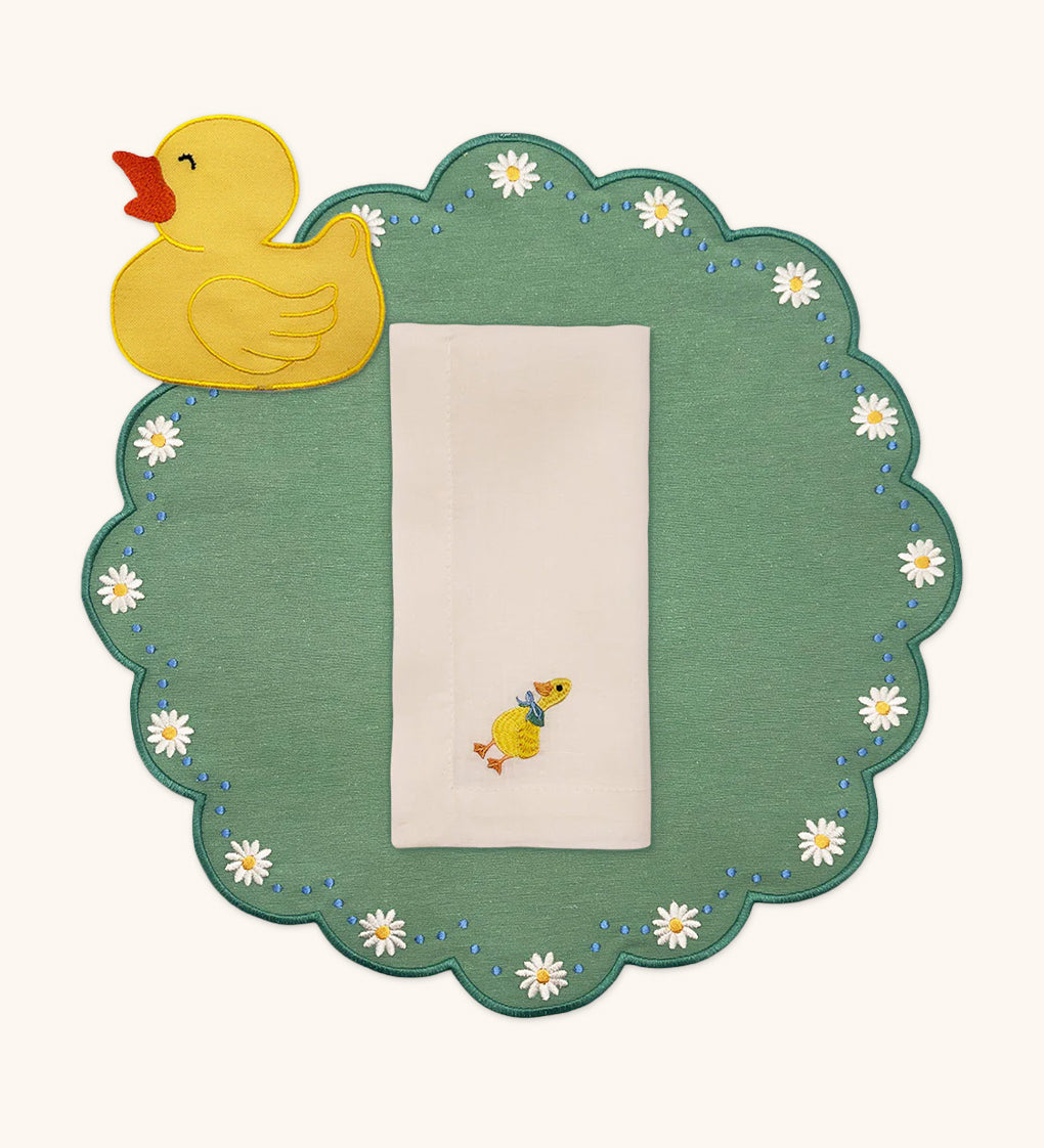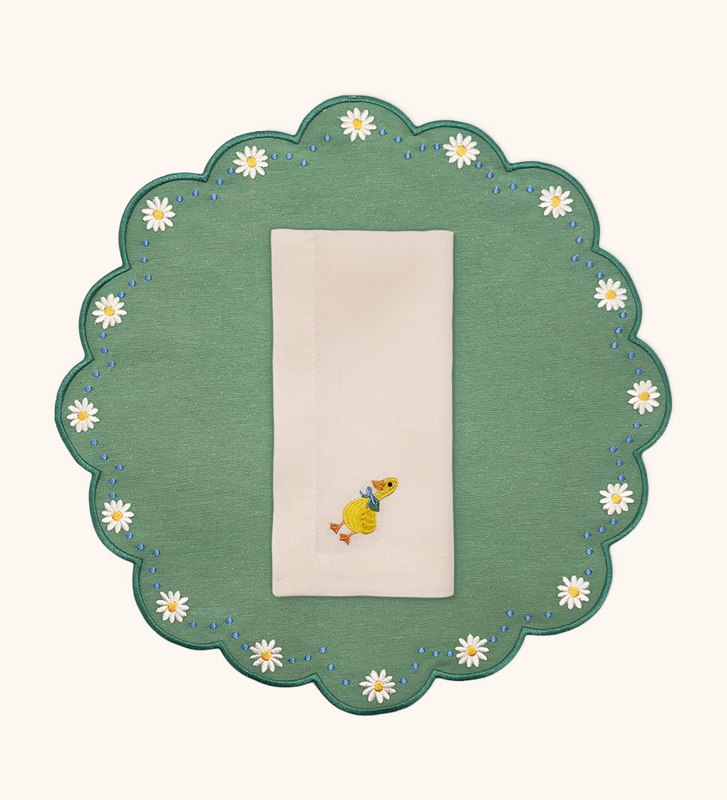 THE DUCKLING ZASHPACK: Set con 4 Servilletas Easter en Lino Ivory con Bordado de Pato, 4 Individuales Pily en Algodón Verde con Bordado de Margaritas y 4 Platos Trinche con Borde de Flores.