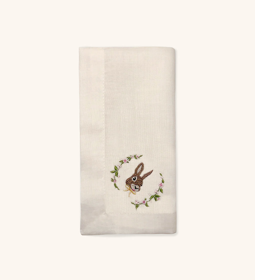 Servilleta Easter en Lino Ivory con Bordado de Conejo con Flores. Set de 4