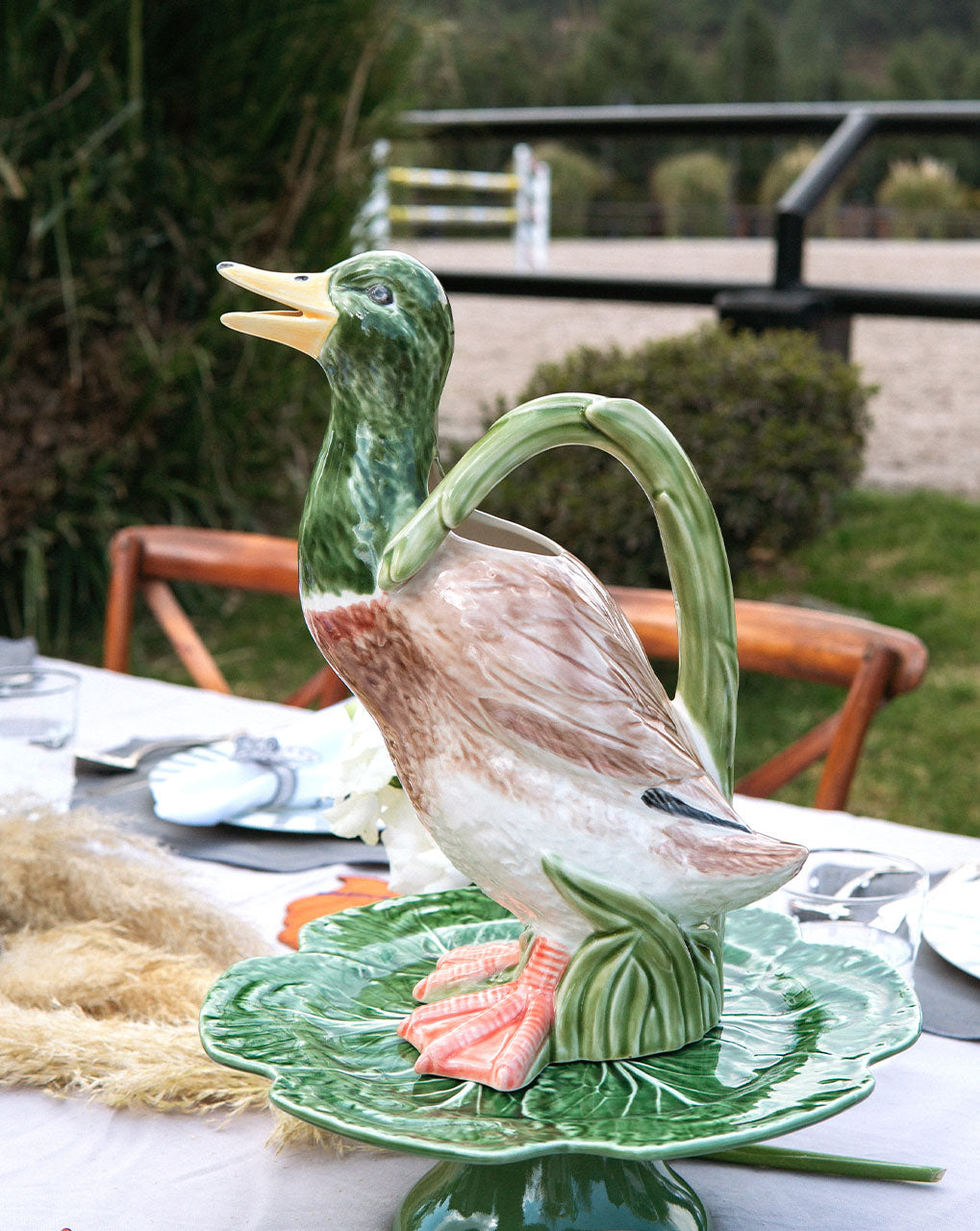 Una hermosa jarra de cerámica en forma de Pato de Bordallo Pinheiro, ideal para traer el bosque a tu mesa