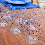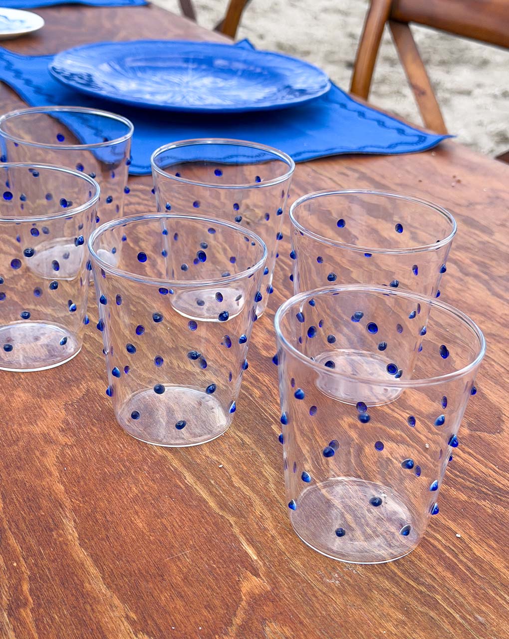 Set 6 vasos de vidrio con puntitos azules hecho de forma artesanal.