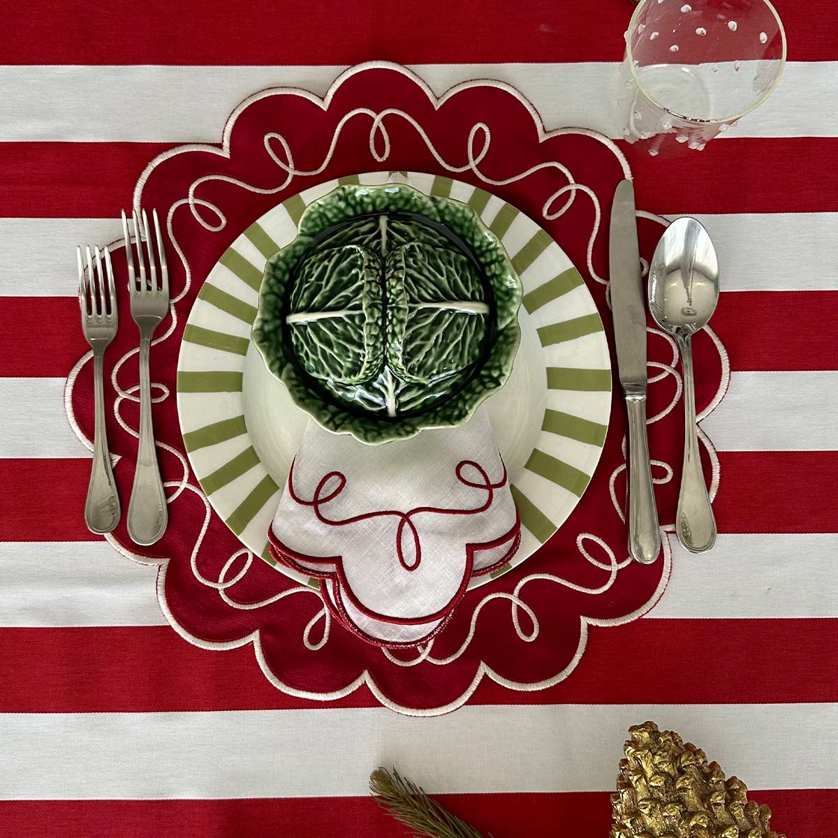 Set de Individuales con Servilletas Regina de Loneta Blanca con Ondas Bordadas en Rojo, set para 4 personas.
