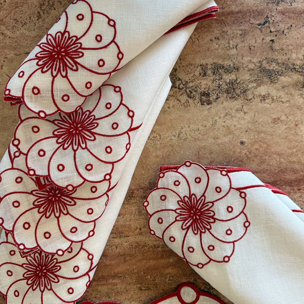 Servilletas Identidad en Lino Blanco con Bordado de Biznaga en Rojo. Set de 4