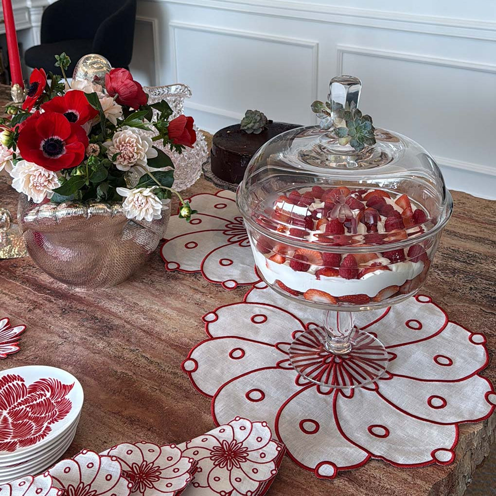 Individuales Identidad en Lino Blanco con Bordado de Biznaga en en Rojo Set de 4