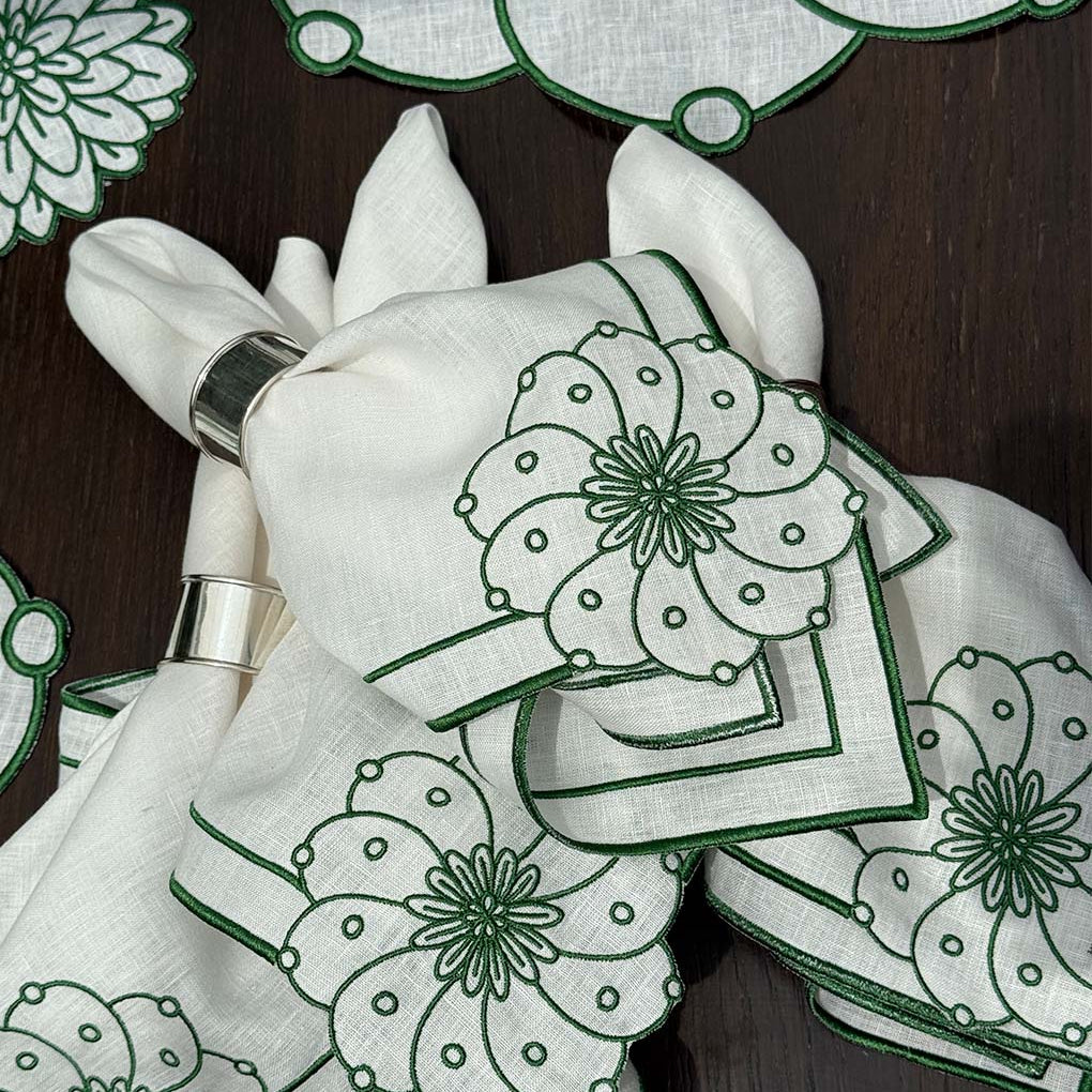 Servilletas Identidad en Lino Blanco con Bordado de Biznaga en Verde. Set de 4