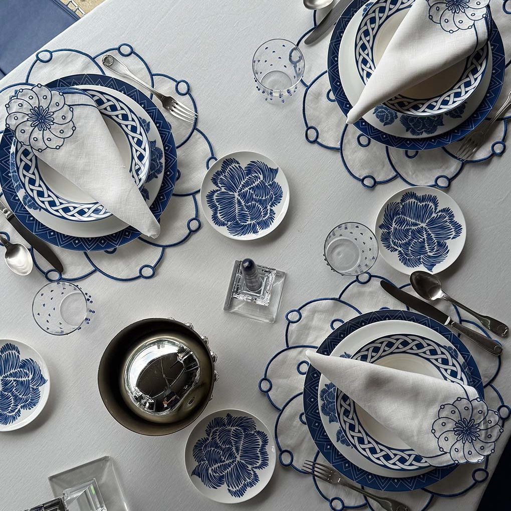 Coasters Identidad en Lino Blanco con Bordado de Biznaga, Paciflora y Dalia Rojas. Set de 4