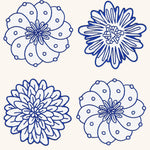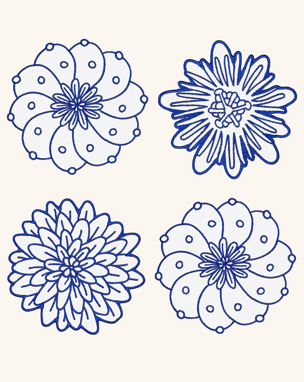 Coasters Identidad en Lino Blanco con Bordado de Biznaga, Pasiflora y Dalia Azules. Set de 4