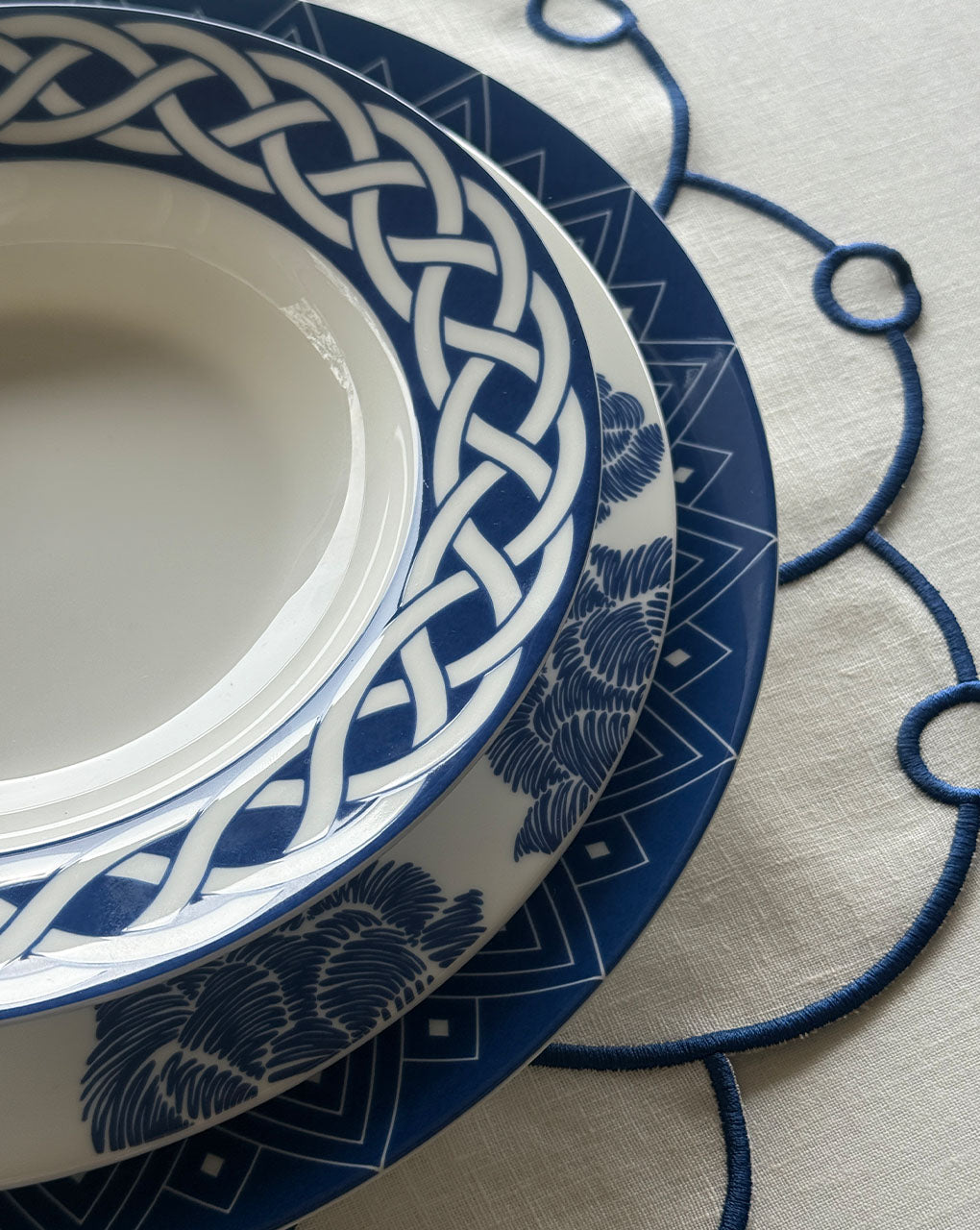 La mantelería IDENTIDAD de Sofía Aspe Interiorismo la esencia de México en cada mesa. Los individuales son confeccionados en lino español bordado en forma de biznaga con hilo azul. Sofisticados y clásicos.
