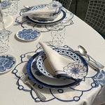 La mantelería IDENTIDAD de Sofía Aspe Interiorismo la esencia de México en cada mesa. El mantel esta confeccionado en lino español con estampado de flores en azul. Sofisticado y clásico.