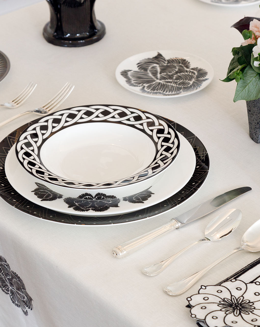 La mantelería IDENTIDAD de Sofía Aspe Interiorismo la esencia de México en cada mesa. El mantel esta confeccionado en lino español con estampado de flores en negro. Sofisticado y clásico.