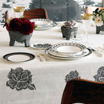 Mantel de Mesa Rectangular en Lino Blanco con Flores Rojas 5 x 2.7m, de la colección Identidad diseñada por Sofía Aspe Interiorismo para Zash