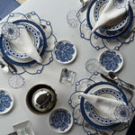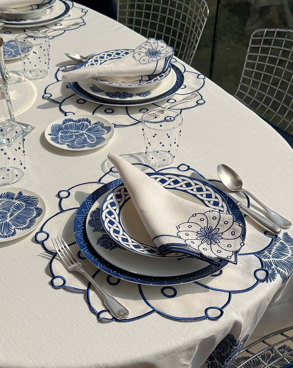 La mantelería IDENTIDAD de Sofía Aspe Interiorismo la esencia de México en cada mesa. Las servilletas son confeccionadas en lino español bordado con un decorado en forma de biznaga con hilo azul. Sofisticados y clásicos.
