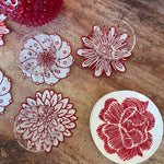 4 Coasters Identidad en Lino Blanco con Bordado de Biznaga, Paciflora y Dalia Rojo.