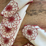 4 Servilletas Identidad en Lino Blanco con Bordado de Biznaga en Rojo.
