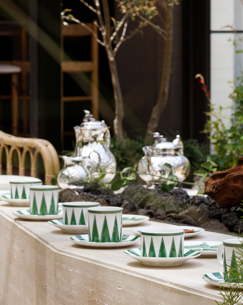 Taza de té de porcelana blanca con rayas verdes, de la colección Identidad diseñada por Sofía Aspe Interiorismo para Zash