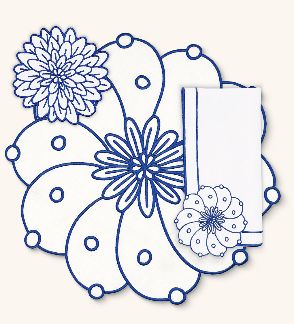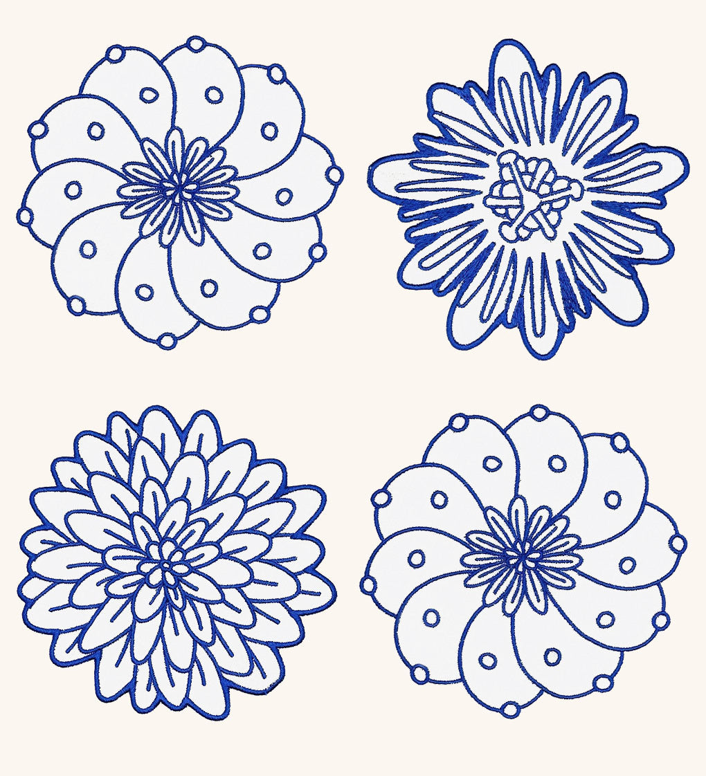 Coasters Identidad en Lino Blanco con Bordado de Biznaga, Pasiflora y Dalia Azules. Set de 4