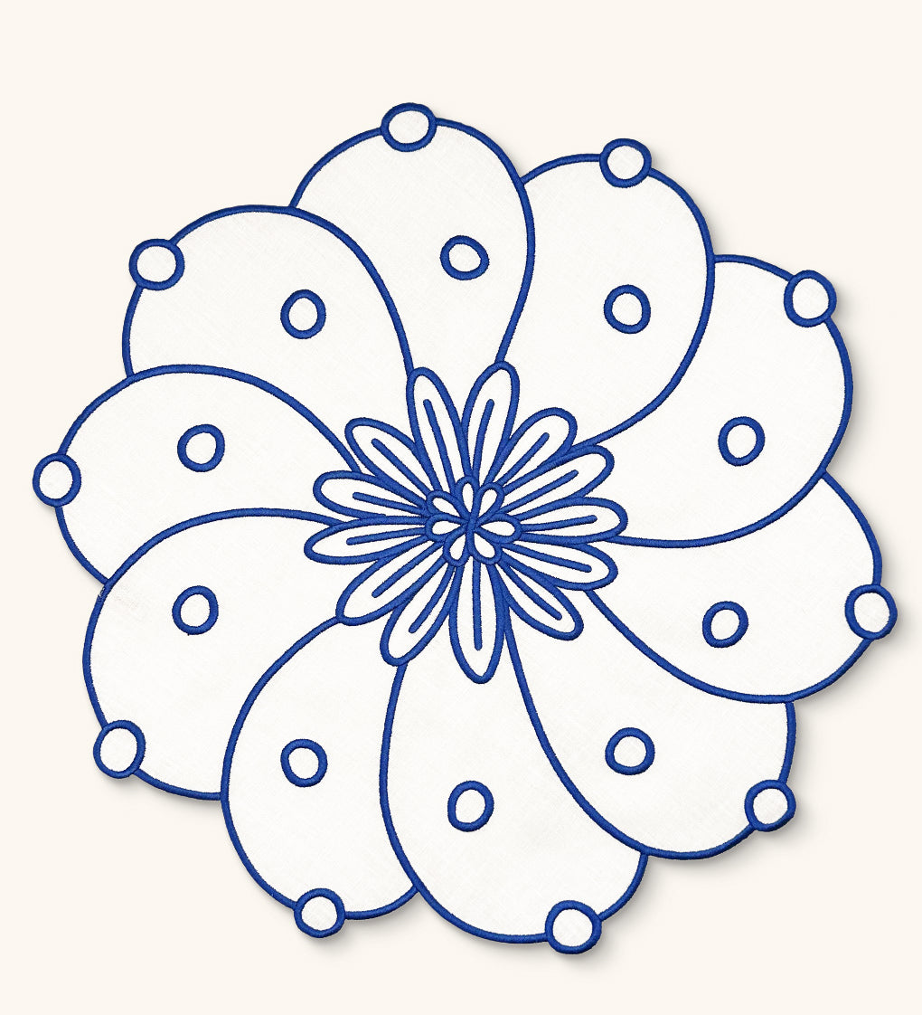 Individuales Identidad en Lino Blanco con Bordado de Biznaga en Azul. Set de 4