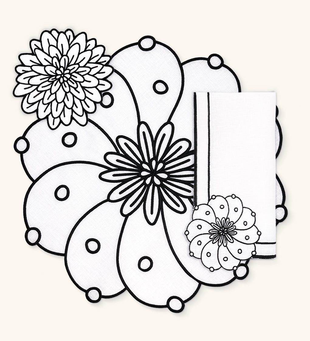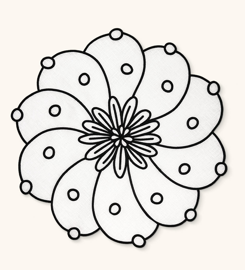 Coasters Identidad en Lino Blanco con Bordado de Biznaga, Pasiflora y Dalia Negras. Set de 4